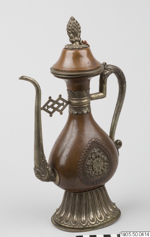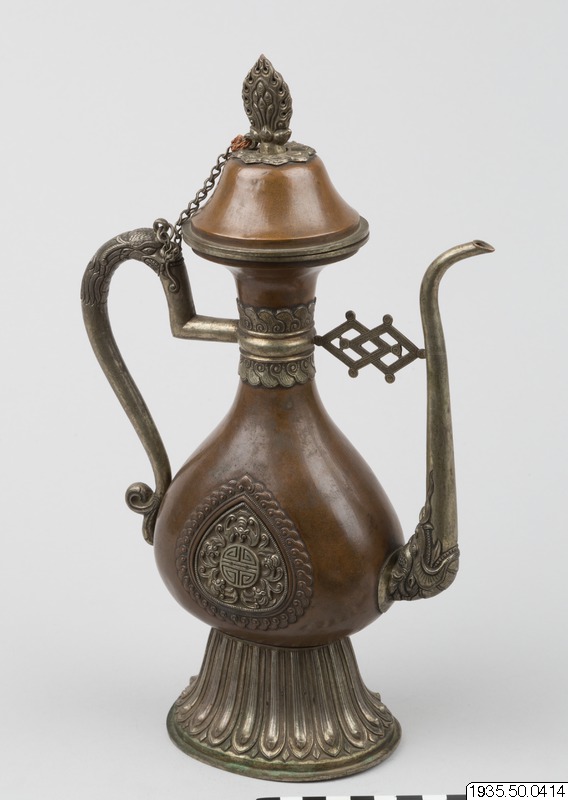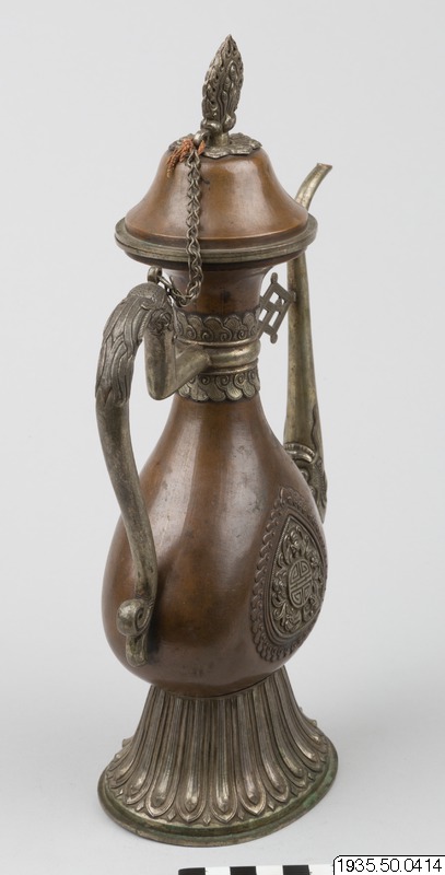 Kanna av driven koppar. Pip och handtag i vit metall formade som drakar. Kannans fot är dekorerad med stiliserade kronblad av lotus av ciselerad koppar överdragen med vit metall. Kannan är på fram och baksida dekorerad med shoutecken, omgivna av fem fladdermöss, som i sin tur omges av en ruyispirebård. Kannans hals som är det smalaste partiet är också dekorerat med ruyispirebårder. Mellan pip och kannans ruyispirebård sitter en dekoration av kungliga örhängen i vit metall. Locket är av driven koppar, och är krönt av en flammande juvel (sanskrit: cintamani) (tib: norbu) i vit metall, som reser sig ur en åttabladig lotusblomma. Locket går ej att ta av i nuvarande skick. (AA) Tempelkanna, antagligen avsedd för vigvatten, möjligen för te vid cermonier. Själva behållarens genomskärning är oval, liksom den höga fotens. Mynningen är rund. (HBE) Foto av liknande kanna: Tsultem. 1987. bild 31.
