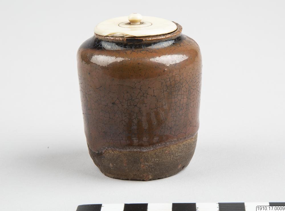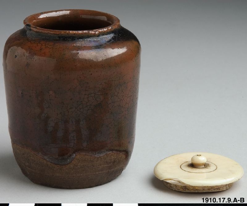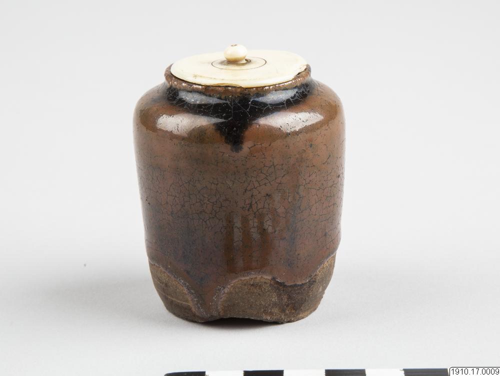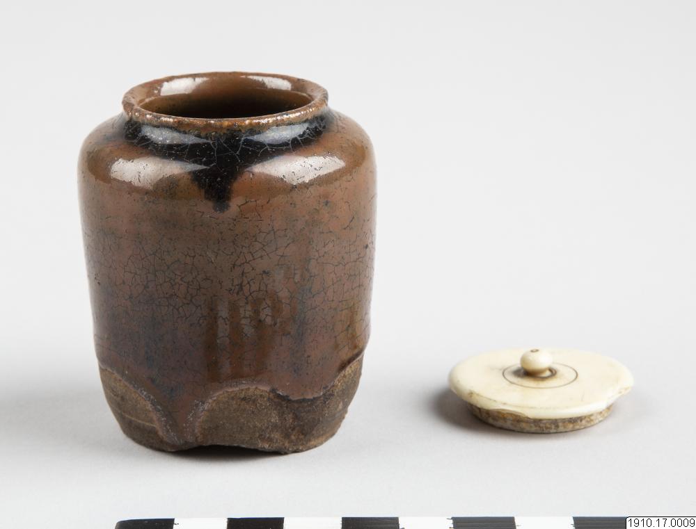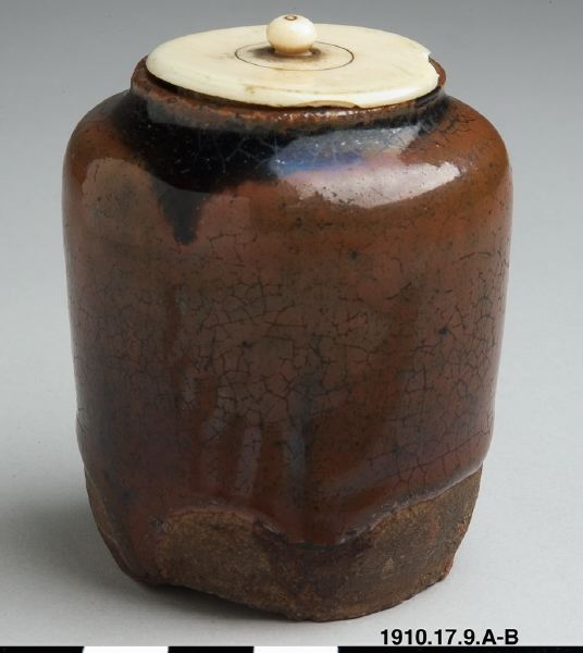 Behållare för det starka teet under teceremonin, chaire. Brunglaserat stengods med svart och rinnande brun, krackelerad glasyr som lämnar nedre delen bar. Lock av elfenben med (tidigare) förgylld undersida. Enligt legenden kommer guldet ändra färg, ifall teet är förgiftat, se Sen 1979 s 30. (PH)