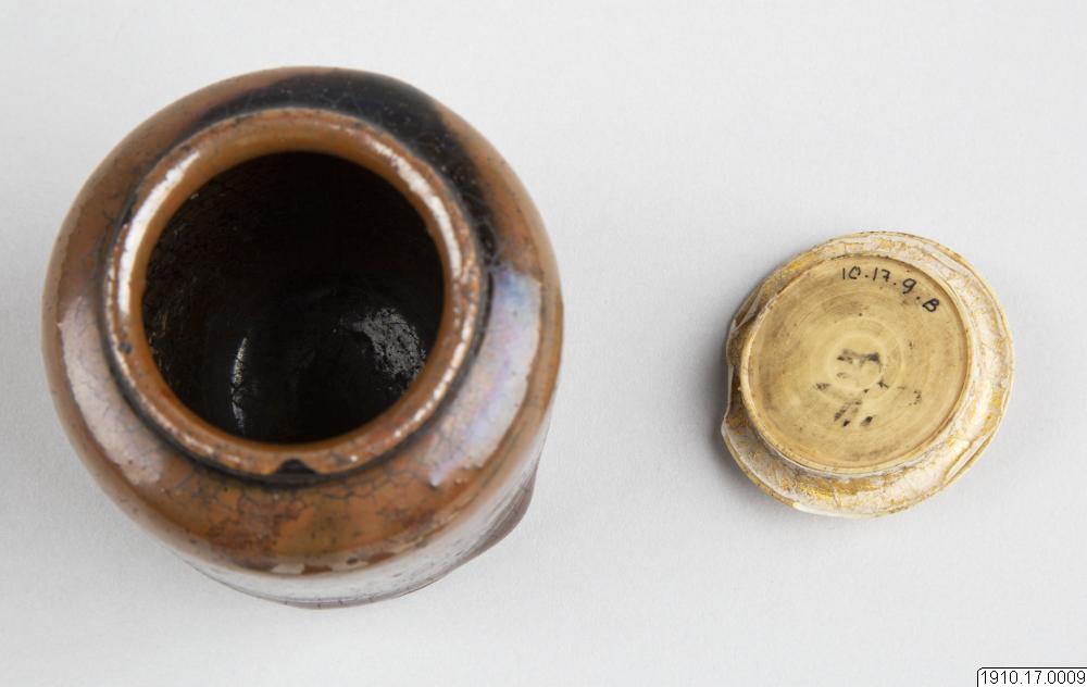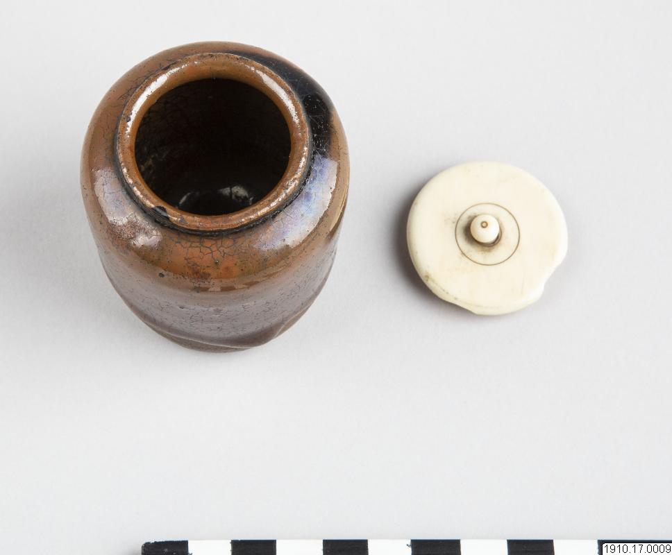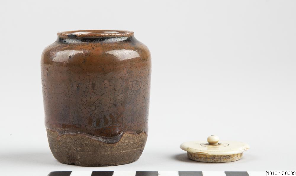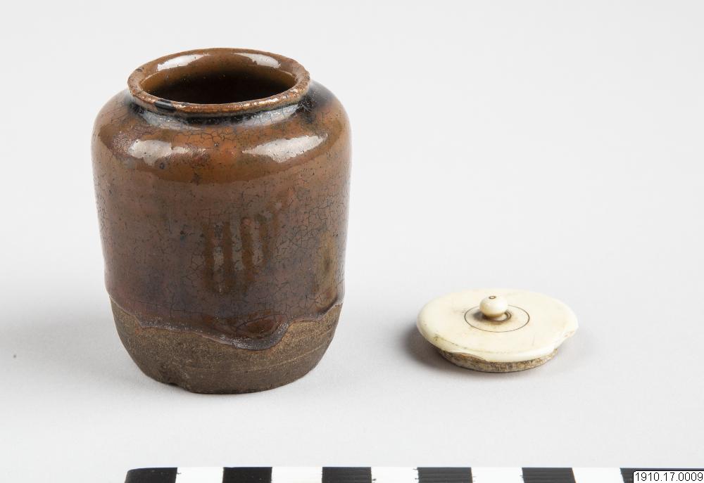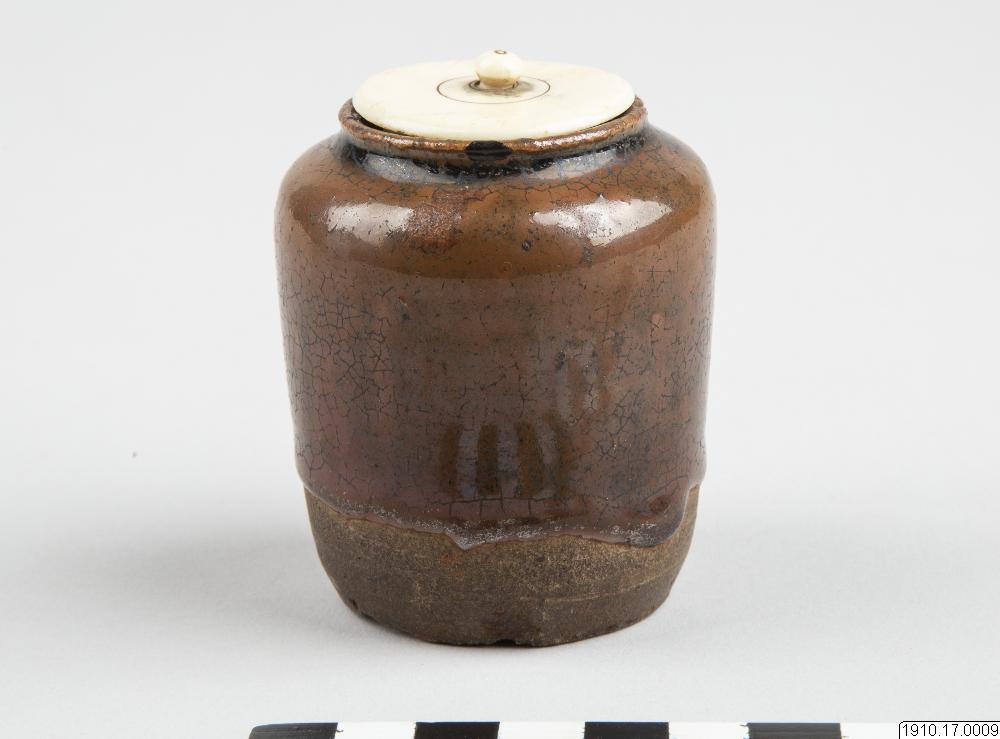 Behållare för det starka teet under teceremonin, chaire. Brunglaserat stengods med svart och rinnande brun, krackelerad glasyr som lämnar nedre delen bar. Lock av elfenben med (tidigare) förgylld undersida. Enligt legenden kommer guldet ändra färg, ifall teet är förgiftat, se Sen 1979 s 30. (PH)