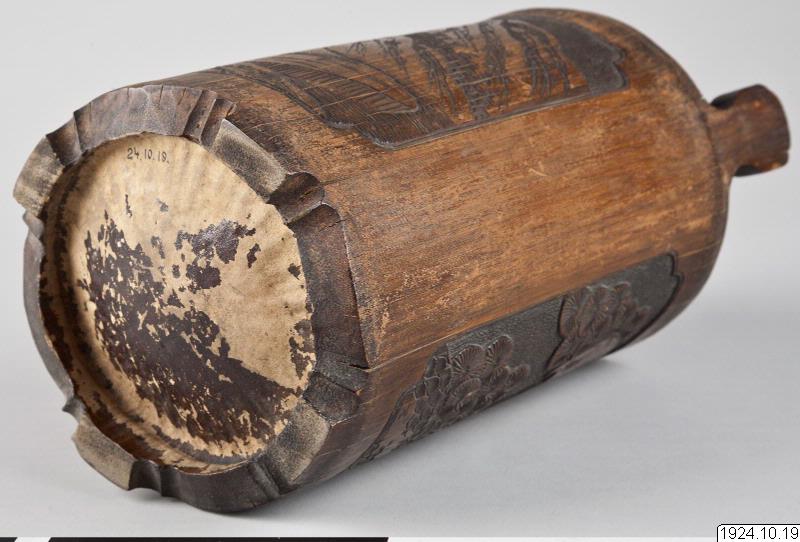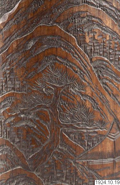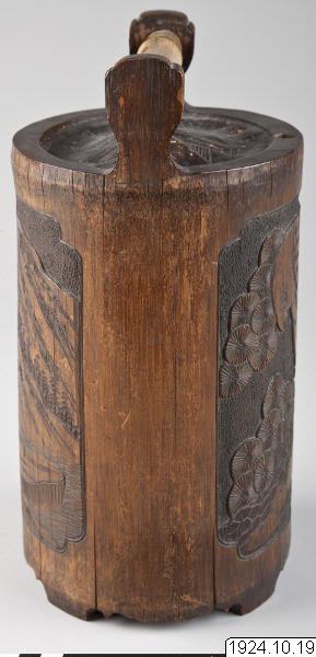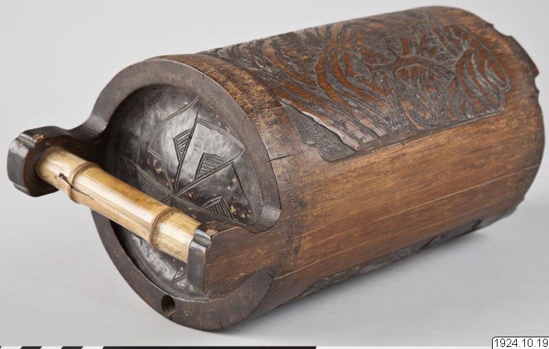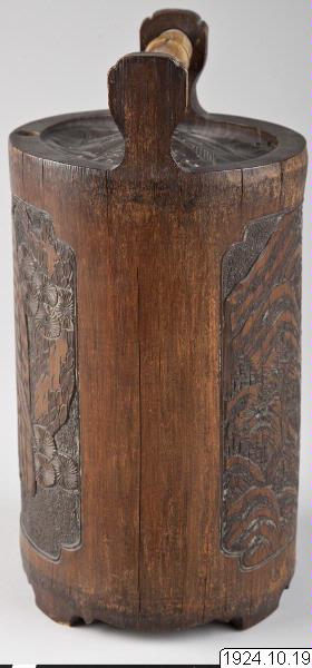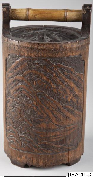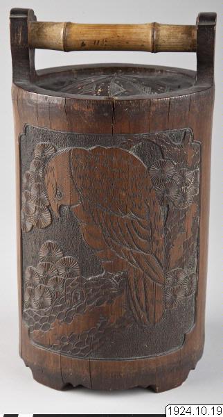 Kärl av kraftig bit mörk bambu med tvärslå (handtag) upptill av ljusare bambu och två paneler utskurna i lågrelief med motiv av falk på tallgren samt landskap med tall och hydda. Den enda öppning som finns är ett litet hål i övre kanten. Fuktionen är tyvärr okänd, men föremålet verkar vara avsett för vardagsgöromål. (PH)