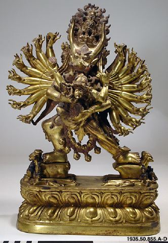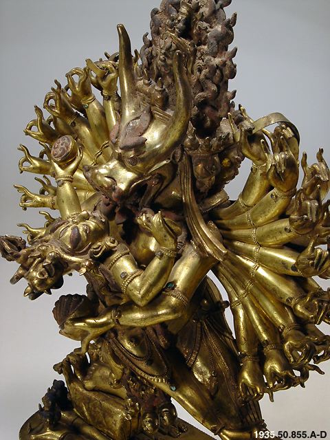 "När dödsguden Yama i form av en blodtörstande tjur var nära att helt avfolka Tibet lyckades bodhisattvan Manjushri besegra honom. Det skedde i gestalt av Yamantaka, en av den tibetanska buddhismens mest skräckinjagande och ikonografiskt mest komplicerade gudomligheter. I den tibetanska dödsboken anges han som väktare över södern. I tillståndet mellan död och återfödelse, bar do, fär den döde möta honom, Det sker under den tredje fasens sjätte dag. Yamantaka är särskilt beskyddare av dge lugs pa-orden och räknas till en av de åtta skräckinjagande dharmapala. Han är en yi dam och en av de tre ishtadevas, tib. gsangs bde ´jigs gsum för den högsta klassen tantras, Anuttarayoga tantra, där han representerar Bhairava-tantra, en text som särskilt propagerades av mkhas grub rje, lärjunge till klosterreformatorn Tsong kha pa. (Ur Karl Gunnar Gardells dokumentation föremålsnr.1935.50.2320)