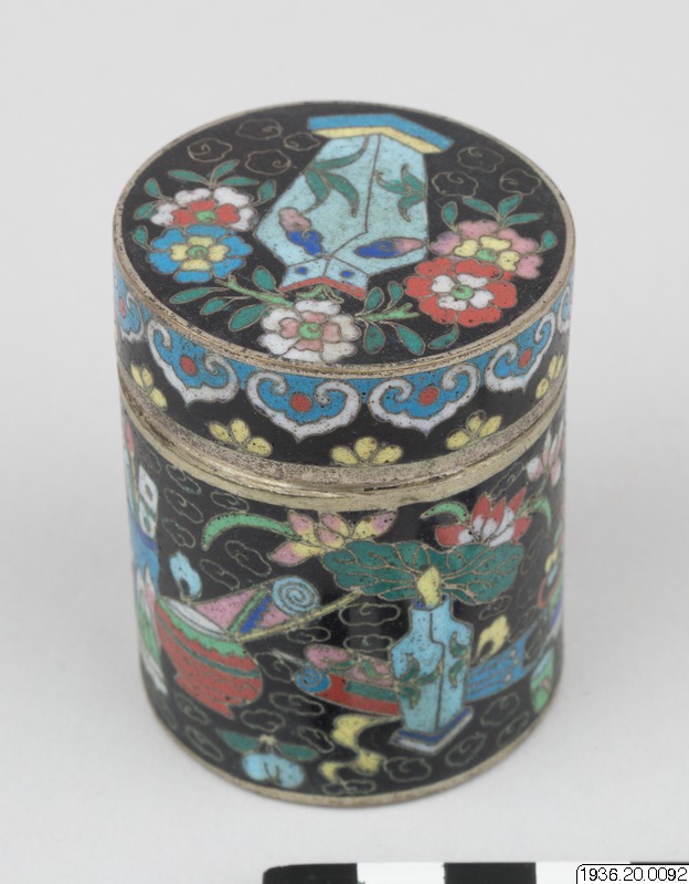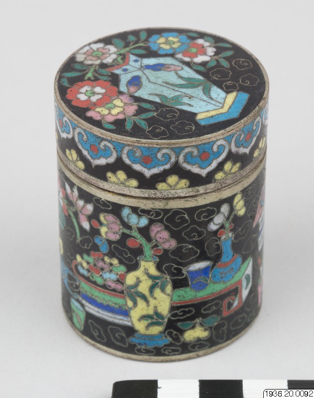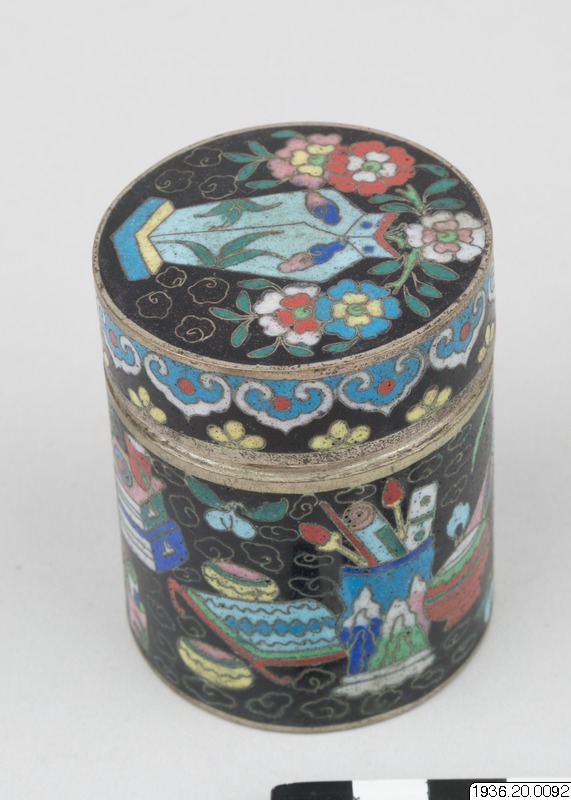 Burk med lock av emaljerad metall i cloisonné-teknik. Burken är dekorerad med diverse konst- och lyckosymboler. Burkens insida och botten är emaljerade.