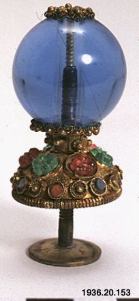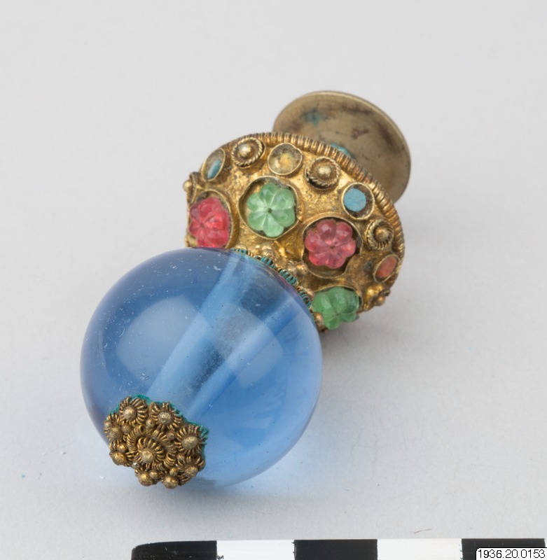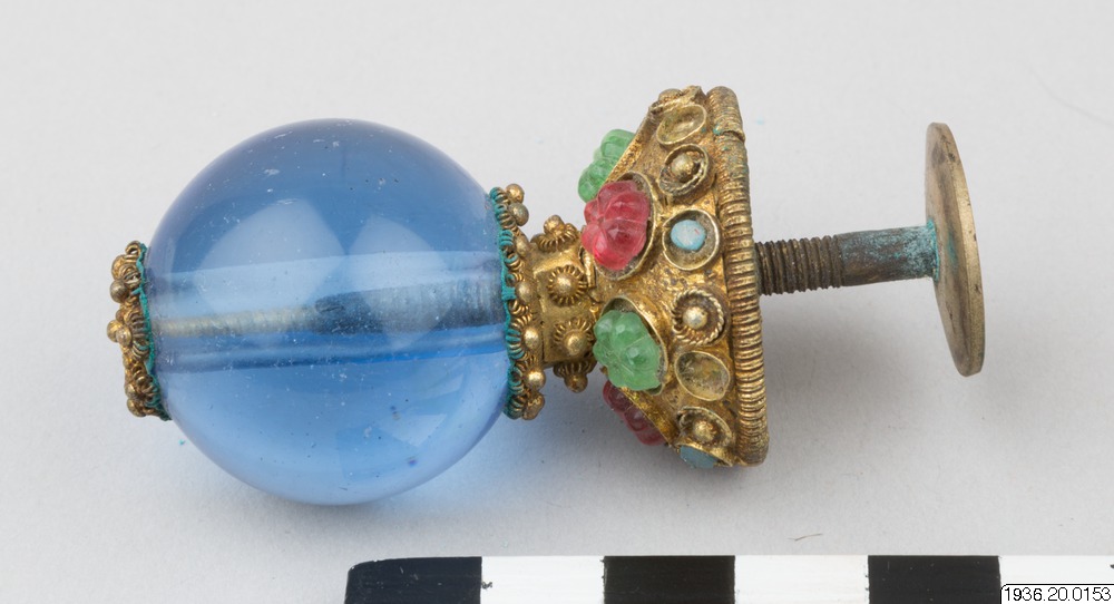 Mandarinknapp av förgylld metall med slät rund kula av blått genomskinligt glas på fot dekorerad med infattade pärlor av glas.