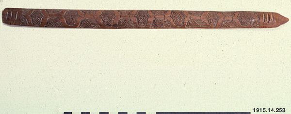 Mustaschlyftare av trä med skuren dekor. På baksidan inskuret märke. Ur katalogen: "Användas vid sakédrickning, dels till att lyfta mustascherna, dels till att doppa i sakékärlet och så kasta några droppar till offer åt gudarna, först framåt till eldgudinnan, så mot höger till "den store anden" (Kamui) och så mot vänster till Yotsisuné (en heroiserad japansk furste, som på 1100-talet blev fördriven till Ainu på Hokkaido)."