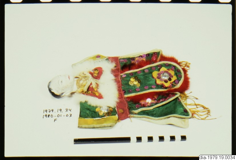 Handdocka med huvud av målat trä och dräkt av textil. Färgen har till stora delar flagnat, mest finns kvar på hjässan, och ansiktsdragen är sannolikt påmålade senare. Dräkt av grön sidensatäng, som fällt på baksidan, mittknäppt, dekorerad med vita och röda pälsbräm och rosa metallan i läggsöm. På nedre delen en gul stiliserad blomma och rosa paljetter samt spegelglas, liksom på sidoflikarna. Palje...