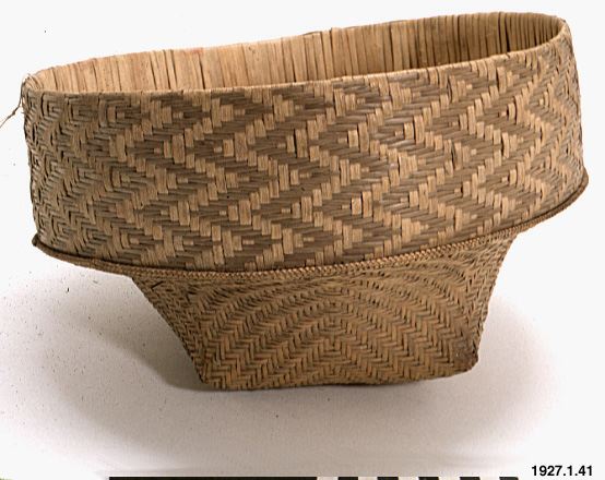 • En av gulbruna och platta fibrer flätad korg. Möjligen ett lock.
