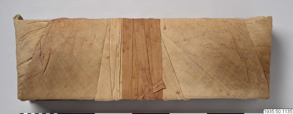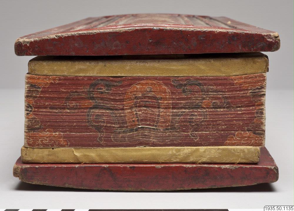 Bok med rödmålade pärmar av trä, försedda med skrift i guldfärg. Omslag av tyg som i nuvarande skick är ljusbrunt. Boken är ej öppnad. (AA) "H.1132 bis H.1147 (inc.: rgya gar skad du/ sa ta sa ha sri ka pra jna pa ra mi ta (Satasahasrikaprajnapramita)/ bod skad du / ses rab kyi p´a rol tu p´yin pa ston p´rag brgya pa/) P.Xyl., ca. 19,5 x 61,5 (14,2 x 51) cm, aufgrund der Inventaraufzeichnungen des Museums müssten sich die 16 Bände auf die Inventarnummern wie folgt verteilen: H.1132 ka H.1140 ta H.1133 k´a H.1141 t´a H.1134 ga H.1142 da H.1135 na H.1143 na H.1136 ca H.1144 pa H.1137 c´a H.1145 p´a H.1138 ja H. 1146 ba H.1139 na H. 1147 ma Es fehlt jedoch Band ca. Statt Band ba ist vorhanden : (inc.: ses rab kyi p´a rol tu p´yin pa stoh p´rag ni su lna pa / dum bu t´a ma / bam po drug cu pa ) P.Xyl., ca. 18,5cm x 61 (13,8 x 51 cm, Band na." (Eimer, Helmut. 1972. s.618)