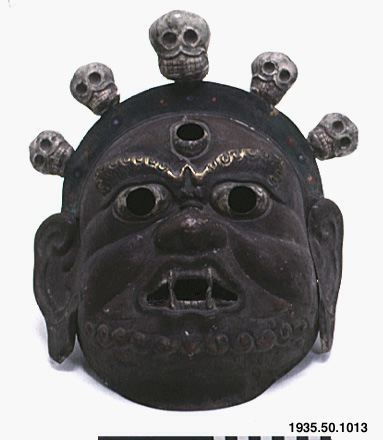 Mask av driven koppar. Målad blå. Masken har tre ögon, förgyllda ögonbryn, vassa hörntänder och skägg. Öron är fästa till masken med nitar. Masken är försedd med en kraniekrona, med fem kranier, vitmålade med röda ögon. (AA) Masken är en dansmask. (MLK) Enligt Karl Gunnar Gardell kan masken föreställa Begtse.