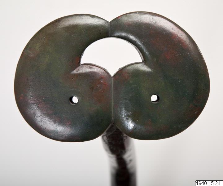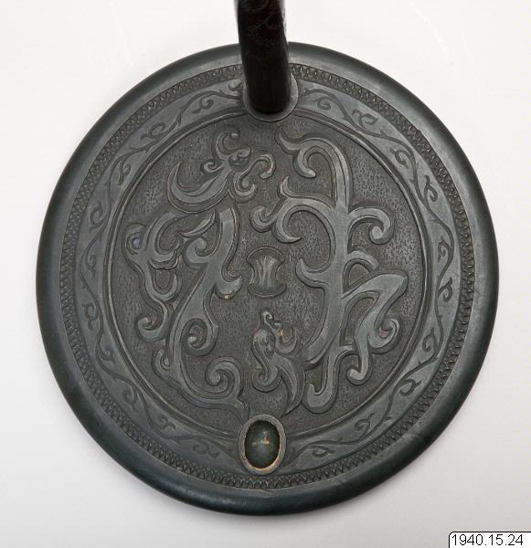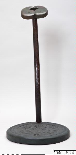 Svärdsställ av trä bestående av en platta med käpp. Dekor på plattan av två stiliserade drakar skurna i träet (influerade av kinesiska bronser?) samt med avslutning på käppen i form av ett stiliserat blad som svärdet kan stödjas mot. (PH)Stäng
