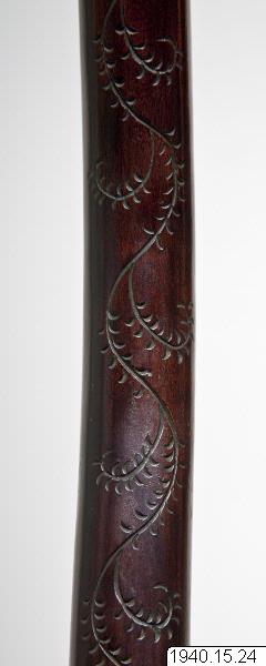 Modernt arbete avsett fö dekorativ uppställning. Består av en rund fotplatta med snidad översida med två stiliserade drakar. Framtill en oval fördjupning i vilken svärdsskidans nedre ända placeras.. Från plattan går en svängd träkäpp upp, vilken avslutas i ett stiliserat blad mot vilkdt svärdet stödes. Plattans diam. 33 cm. Käppens höjd 60 cm. [ocr]