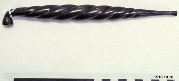 • Tobakspipa (kiseru) av vitmetall i alla delar (munstycke, huvudstycke och mellanparti) som är spiralvriden, tjockast på mitten av pipan. (PH)