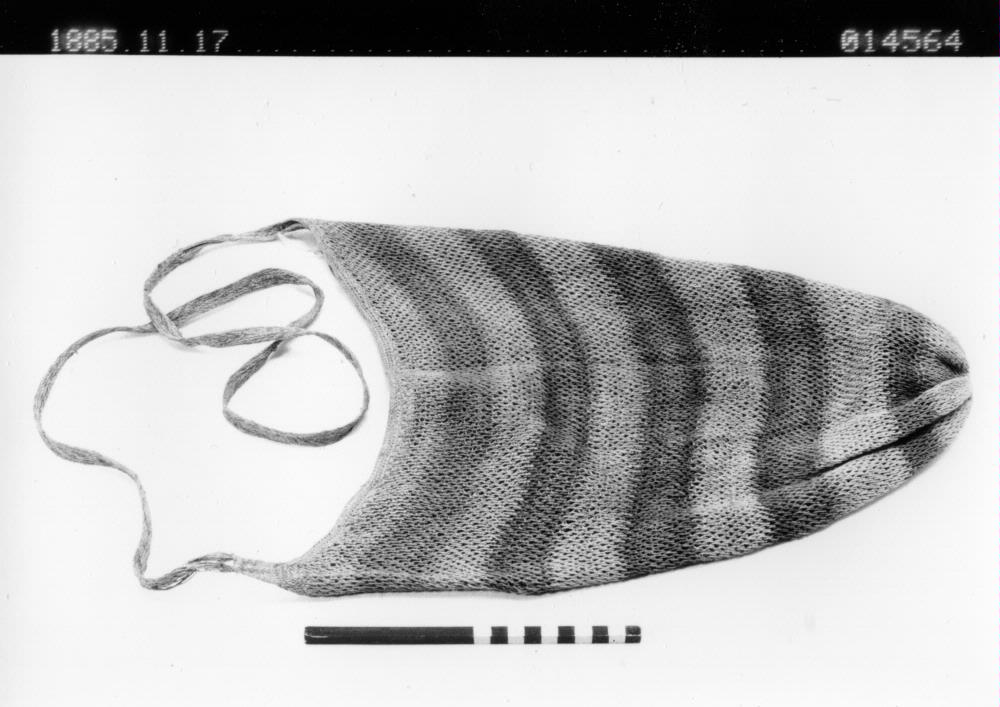 Väska med bärband, av bastsnören, prydd med tvärränder i brunt och grått. Se beskrivning i Bovallius "En resa i Talamanca-indianernas land. Ymer 1885 s 194.