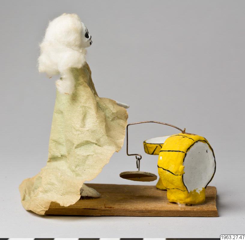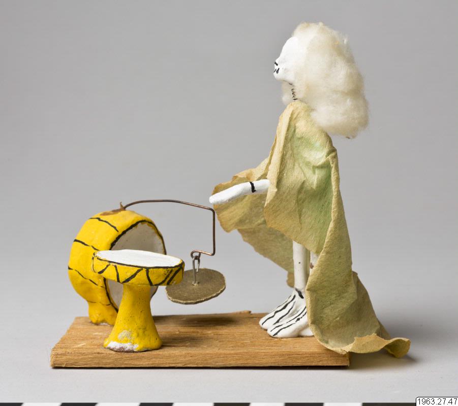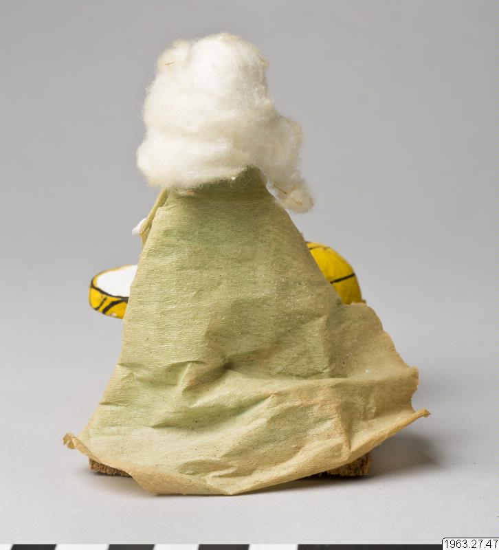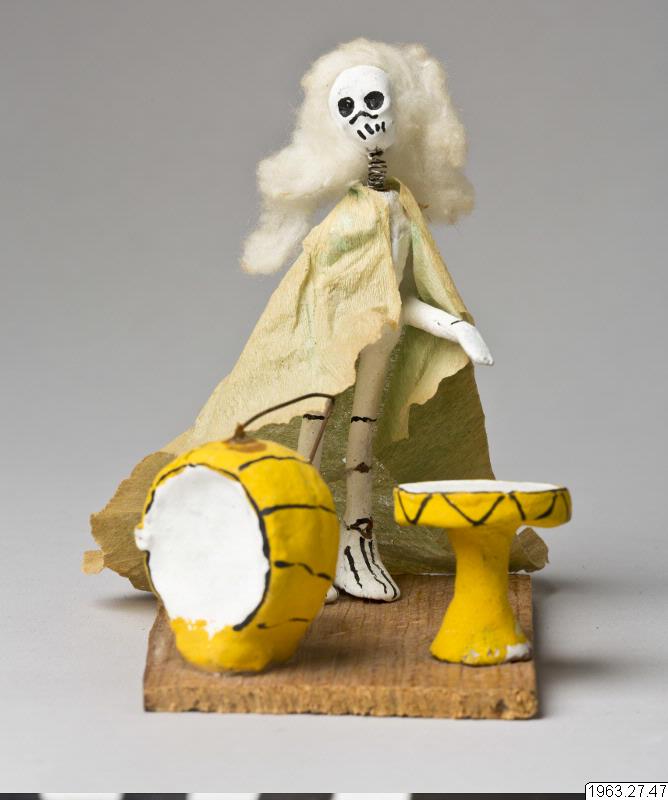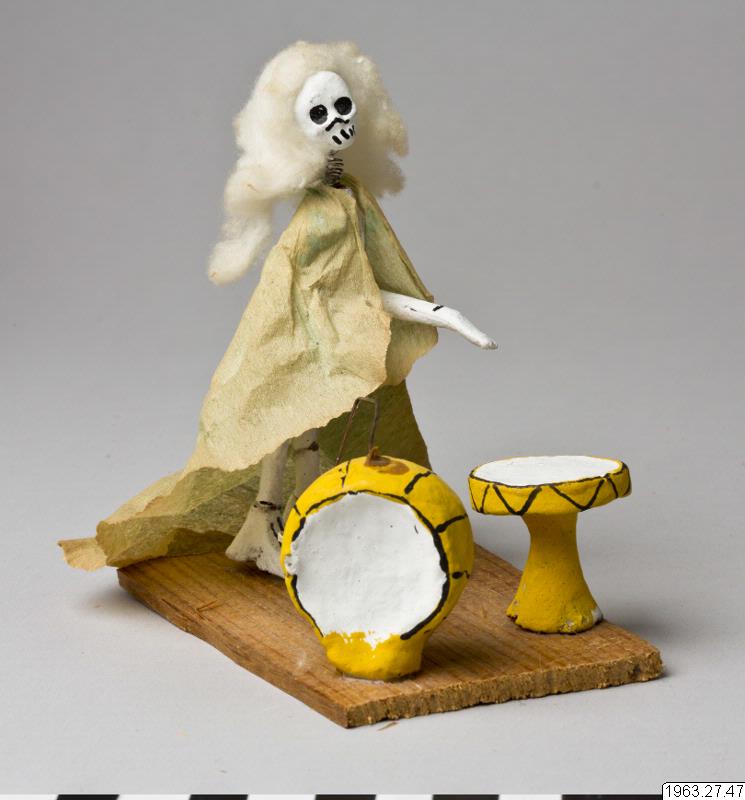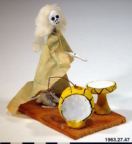 Skelett, "Calavera" av gips med rörligt huvud, hår av bomull, iförd mantel av grönt kräpppapper, stående och spelande trumma och slagverk. Inköpt 1963 i Viktor´s butik för mexikansk folkkonst i Mexico City. Höjd ca 9 cm. Mexico. (generalkatalogen)
