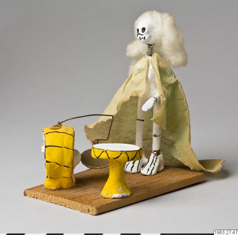 Skelettet, calavera, är en figur som spelar trummor. Tillverkas och används som altardekoration i hemmen i samband med firandet i Mexico av de dödas dag, alla helgons dag.