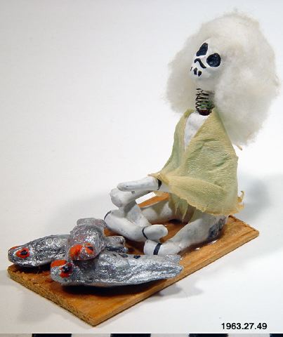 Sittande skelett, "Calavera" av gips med rörligt huvud, hår av bomull och iförd mantel av grönt kräpppapper, säljande fisk. Inköpt 1963 i Viktor´s butik för mexikansk folkkonst i Mexico City. Höjd ca ...