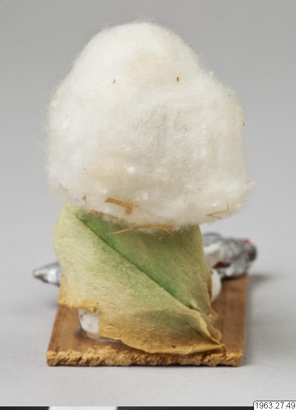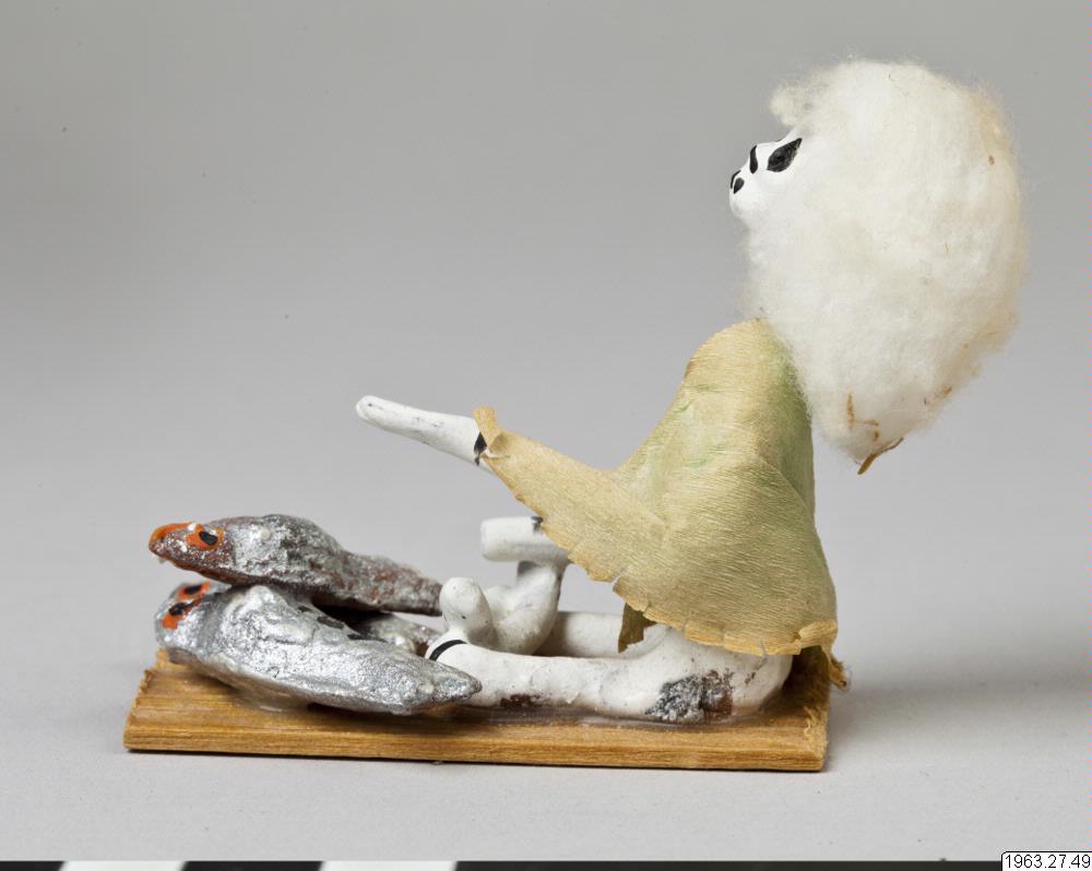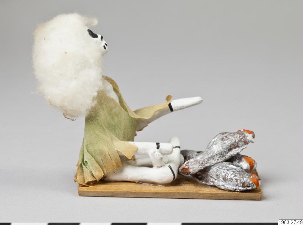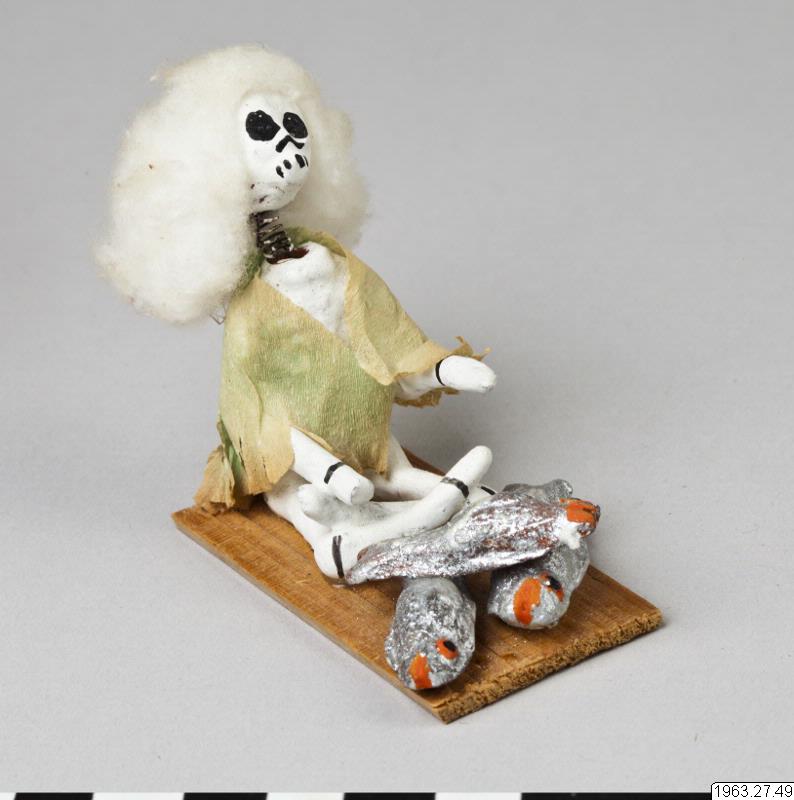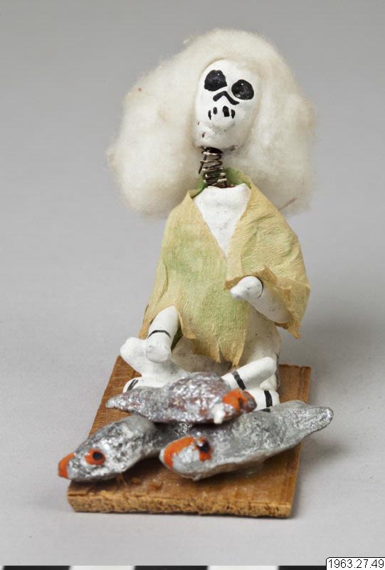 Sittande skelett, "Calavera" av gips med rörligt huvud, hår av bomull och iförd mantel av grönt kräpppapper, säljande fisk. Inköpt 1963 i Viktor´s butik för mexikansk folkkonst i Mexico City. Höjd ca 6 cm. Mexico. (generalkatalogen).