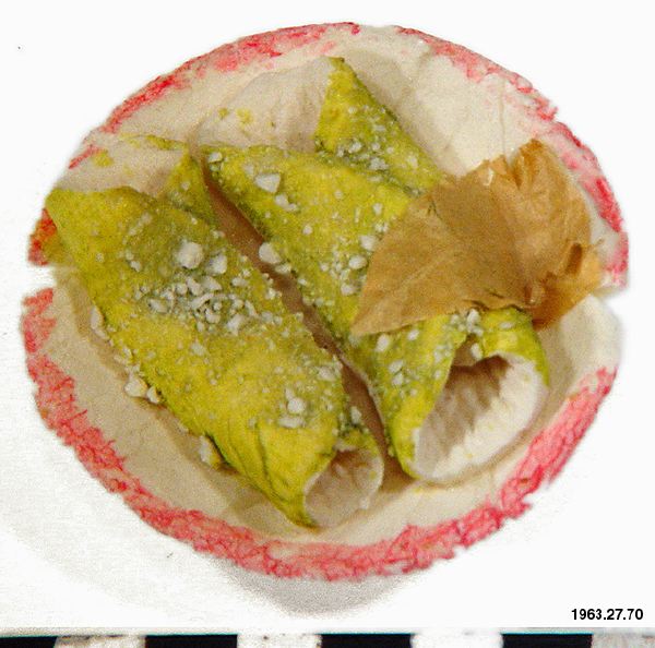 Miniatyrtallrik med tamales. Tamales är en mexikansk maträtt som tillverkas av majsdeg. Tallriken är gjord i färgad karamellmassa. Många miniatyrer tillverkas och används som altardekoration i hemmen i samband med firandet i Mexico av de dödas dag, alla helgons dag. Eftersom man på altarna sätter fram det som den döde tyckte speciellt mycket om i livet, tillverkas också sådana här miniatyrtallrikar med maträtter i samband med de dödas dag.