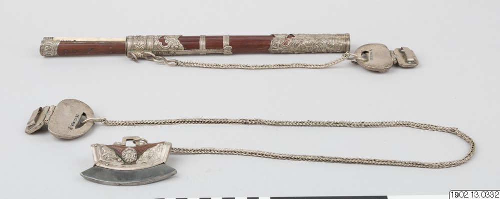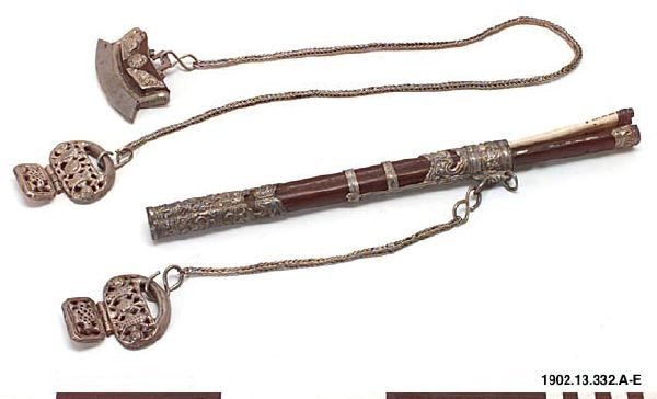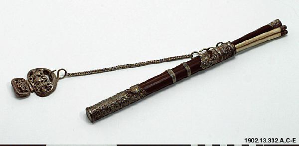 • "Knivuppsättning. Kniv och två ätpinnar i fodral av trä med tunna silverbeslag. Förenad med en kedja av silver, ett hängbeslag av samma material.