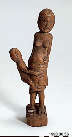 • Omålad figur av bintawas-trä. Skulpturen föreställer en gravid, stående kvinna med ett barn.(Generalkatalogen)