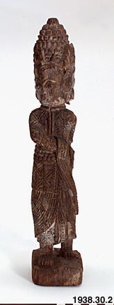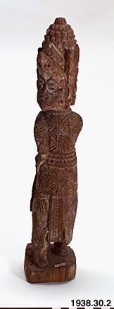 Gudabild. Tempelfigur (arca lingga eller pratima) av skuret trä. Skulpturen föreställer en manlig stående figur. Det finns en fågelmask på huvudets baksida, Garuda mungkur, som troligtvis har en skyddande effekt.