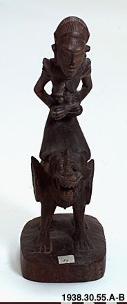 Skulptur av asem-trä. Skulpturen föreställer en kvinna som rider på en singa. Singa är ett fyrfota fabeldjur med vingar. (Generalkatalogen)