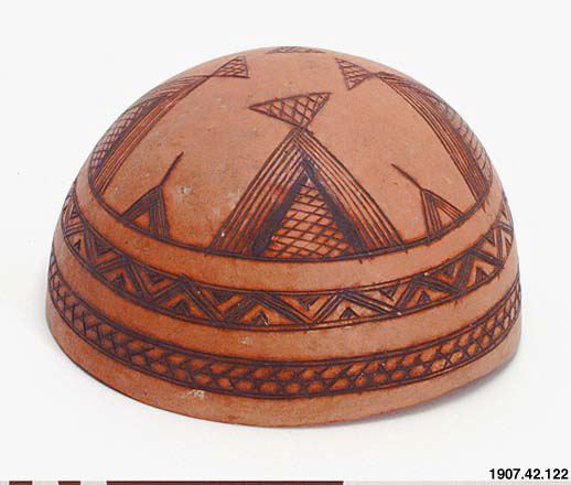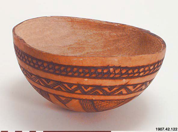 Skål av kalebass för mat. På utsidan har skålen en dekor som brännts in, "glödritat" enligt generalkatalogen. Där uppges "Hamham" som det lokala namnet. (HTB)