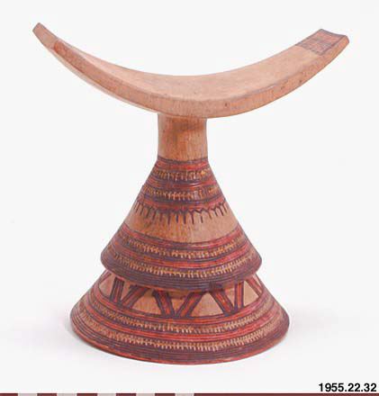 Nackstöd utskuret i ljust trä. Stödet har en ristad dekoration som är färglagd i rött och violett. Den konformiga foten är skuren i två avsatser där den undre delen ser ut att ha fogats in i den övre, hela nackstödet är dock utskuret ur ett enda trästycke.