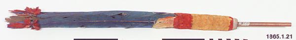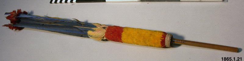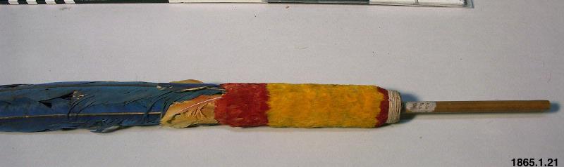 Scepter av fjädrar. Korta röda och gula fjädrar. De långa arara-stjärtfjädrarna är blå med gul insida och har små röda fjädrar i topprosetterna. Längd 68 cm, handtaget 13 cm. Generalkatalogen/Is [[Etno]]