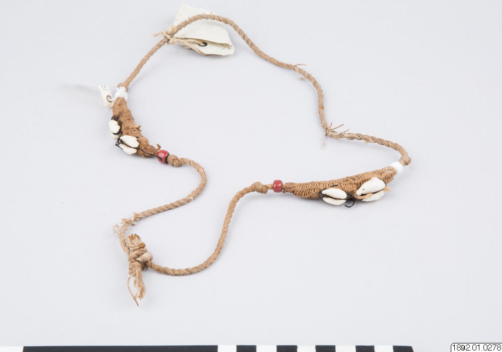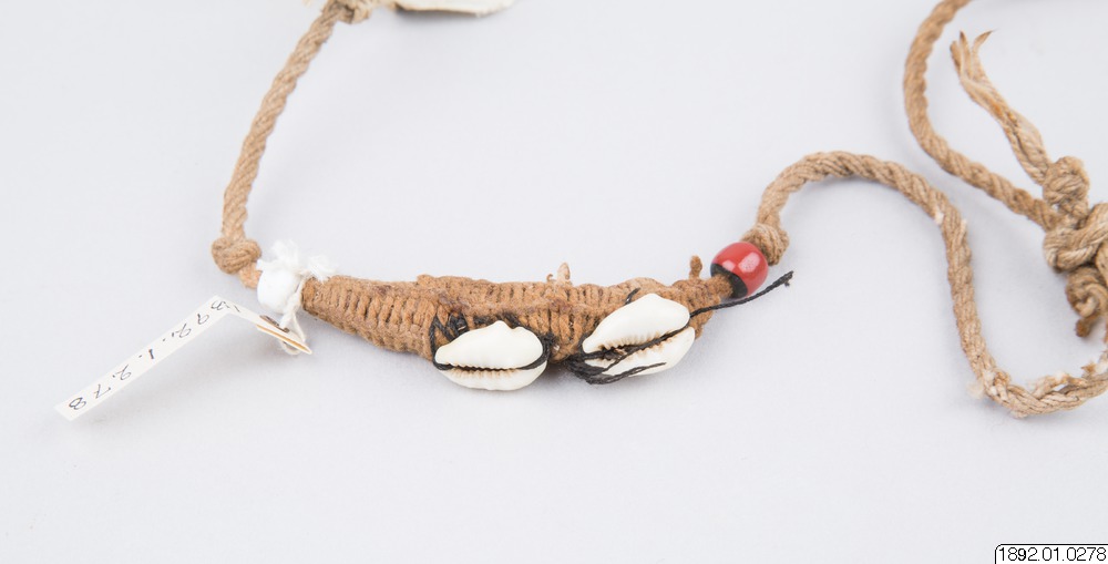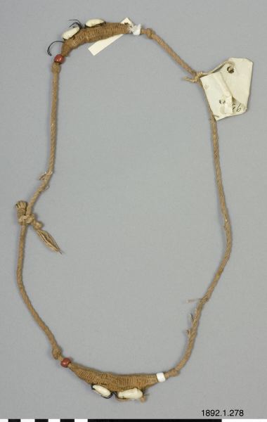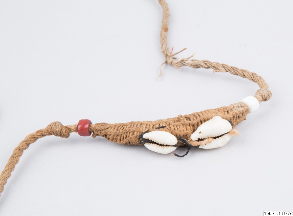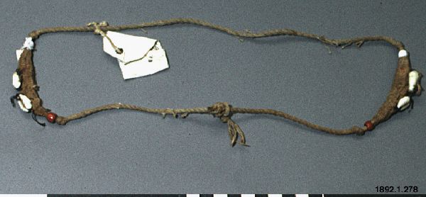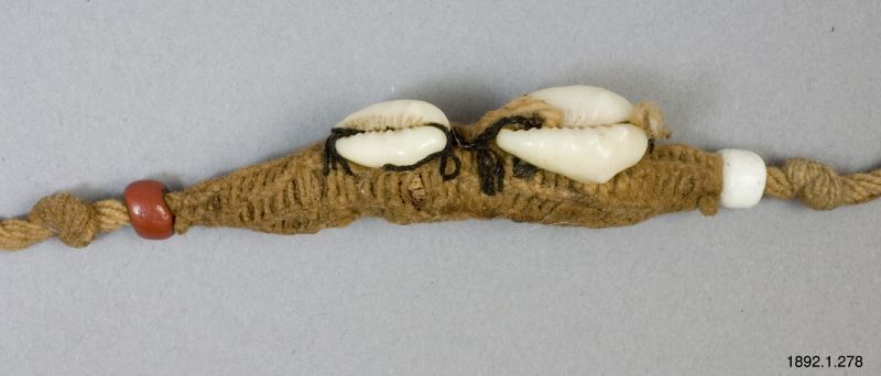 Fetisch i form av armband. Grovt fibersnöre med två spolformiga utvidgningar åstadkomna genom ett flätverk med finare snöre och prydda med ett par fastsydda snäckor. En vit eller röd glaspärla markerar spetsen åt vardera hållet på den spolformiga utvidgningen.