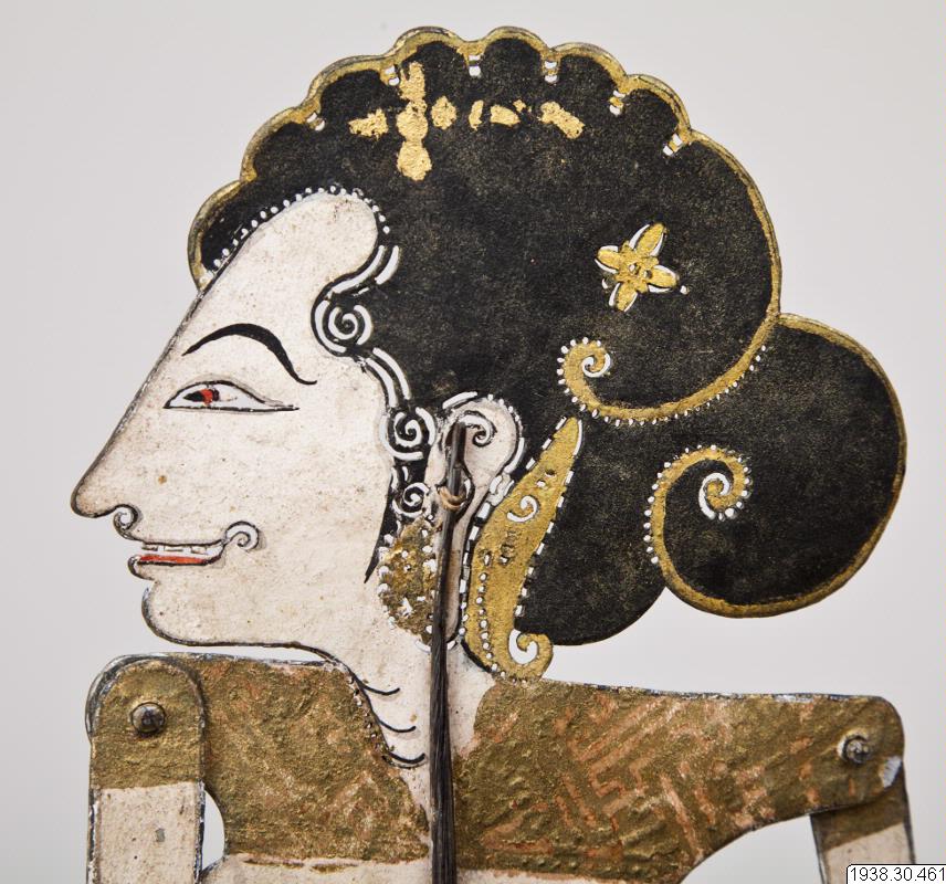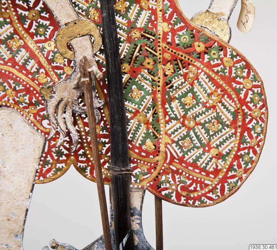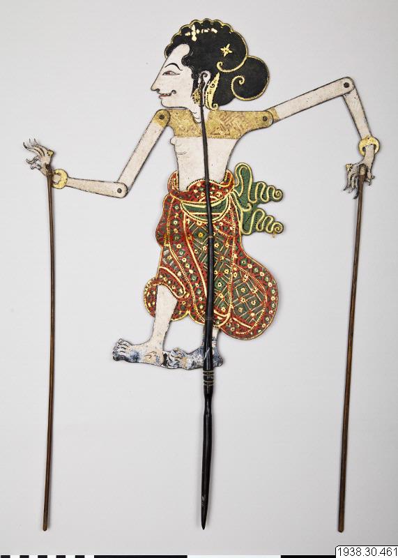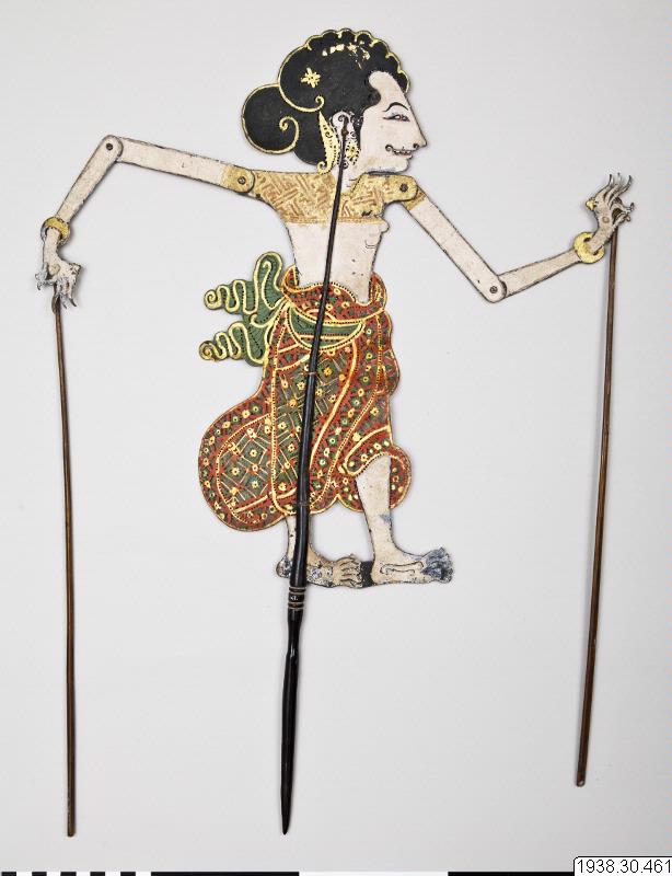 Skuggspelsdocka av ogarvat läder, från ko eller vattenbuffel. Dockan är monterad i en trästav som kluvits ca två tredjedelar av sin längd, den okluvna delen av staven fungerar som handtag. Dockans armar, som kan böjas vid axel och armbåge, manövreras med smala stavar fästade vid vardera hand.