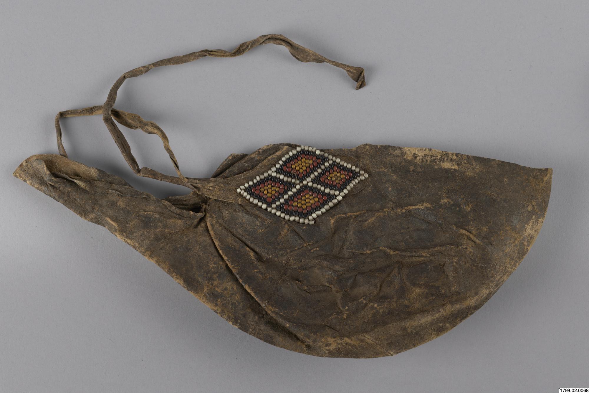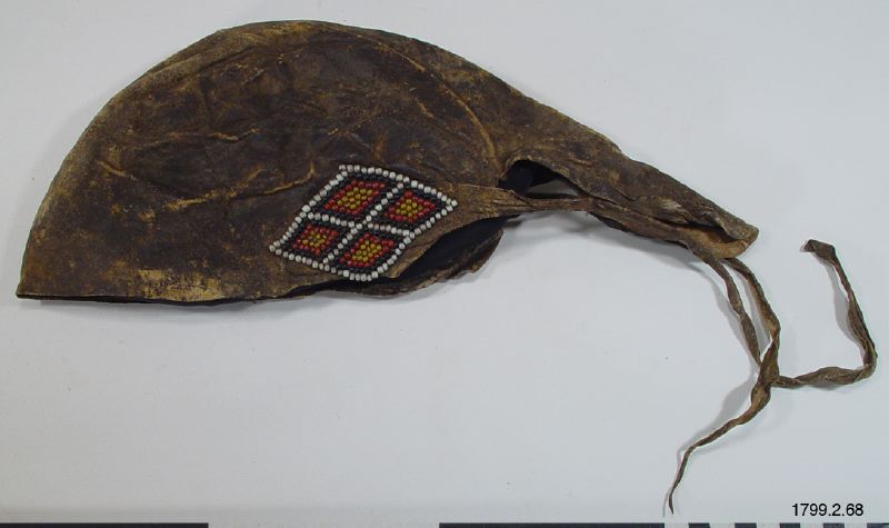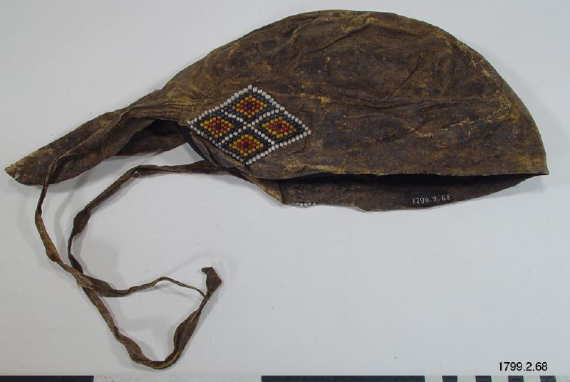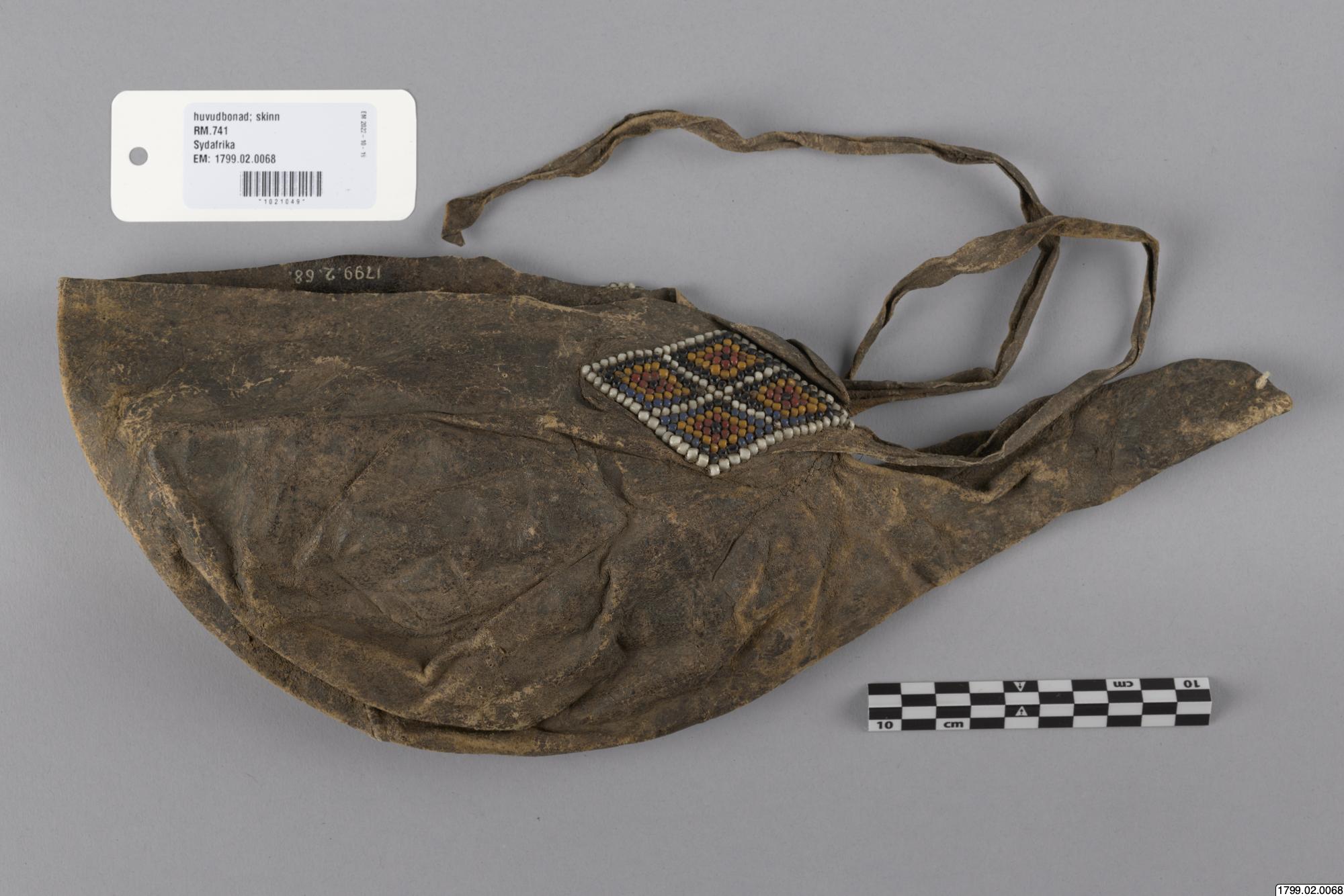 Kvinnomössa af skinn, broderad mer perlor. Generalkatalogen. På vardera sidan av mössan har applicerats dekor bestående av 4 fält med föd, gul svart/blå samt vita små "pärlor", möjligen från snäckor. Sparrman förvärvade denna mössa från ¿en rik hottentottänka¿. Den är i mjukt skinn och med pärldekorationer i samma mönster på ömse sidor. Sparrman skriver att de flesta hottentottkvinnor han mötte var barhuvade, men de kunde också ha en något konformad mössa, ofta svart av fett och rök, och Sparrman tillägger att på det hela taget såg huvudbonaderna inte så illa ut. Andra resenärer på Kap i slutet av 1700-talet nämner huvudbonader av päls eller skinn från schakal och andra djur.WÖ Sparrman skriver i AFRICAN ART AND ARTEFATCTS, s197, att mössan kom från en kvinna inom Gunjamenagruppen vilka troligtvis bodde i regionen runt Capehalvön under perioden för insamlandet. KB