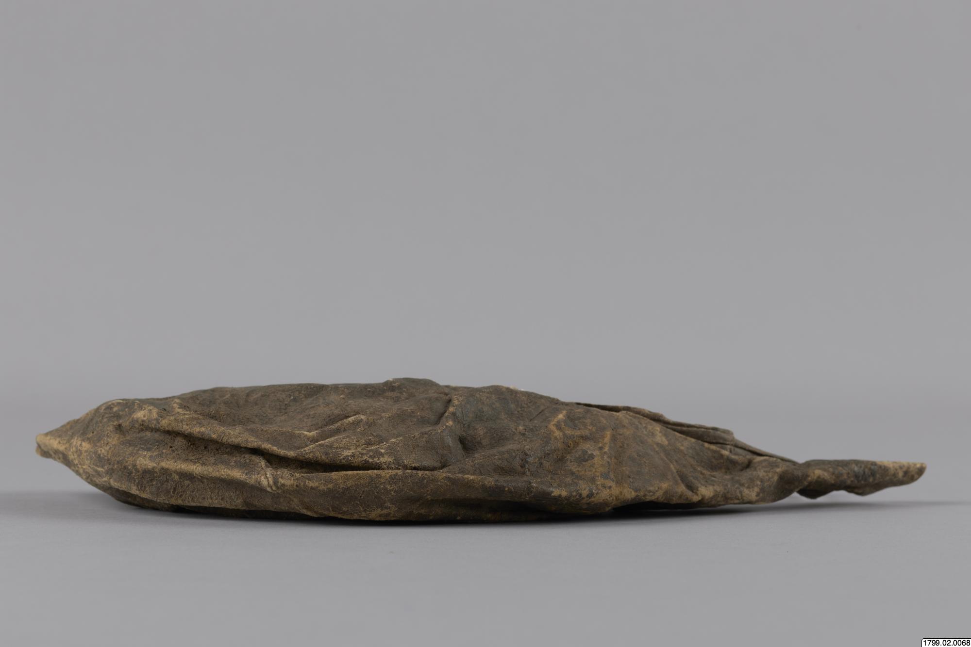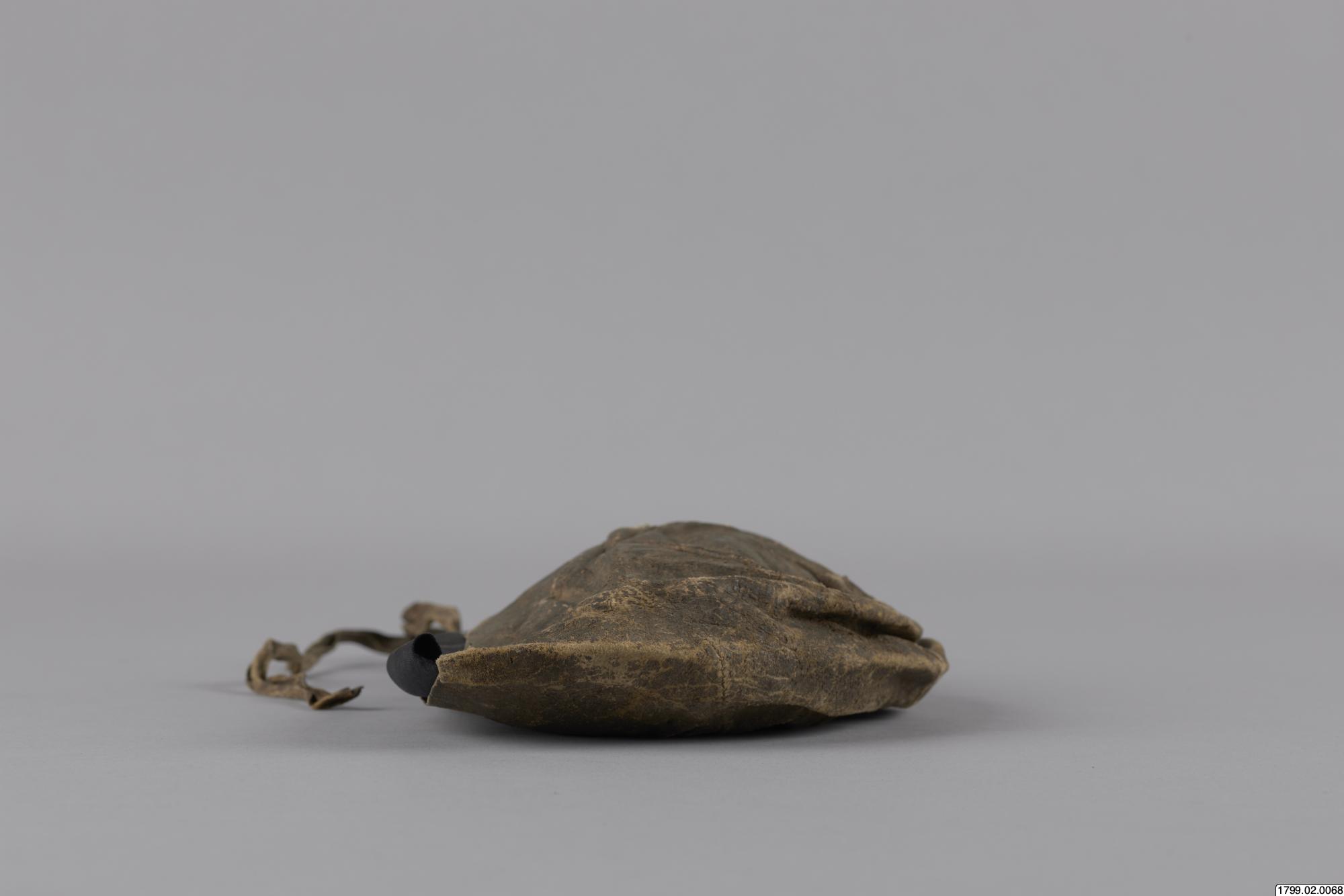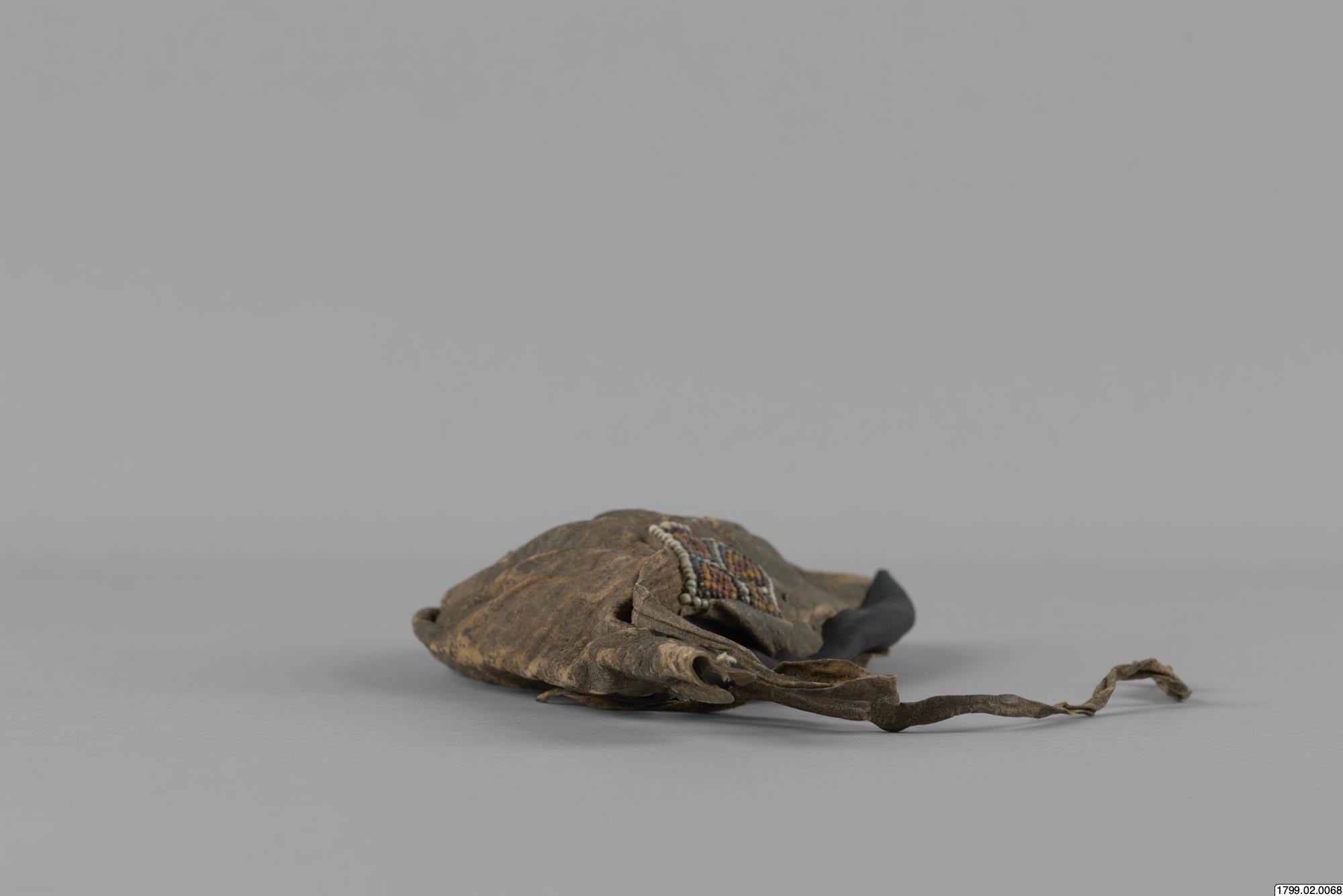 Kvinnomössa af skinn, broderad mer perlor. Generalkatalogen. På vardera sidan av mössan har applicerats dekor bestående av 4 fält med föd, gul svart/blå samt vita små "pärlor", möjligen från snäckor. Sparrman förvärvade denna mössa från ¿en rik hottentottänka¿. Den är i mjukt skinn och med pärldekorationer i samma mönster på ömse sidor. Sparrman skriver att de flesta hottentottkvinnor han mötte var barhuvade, men de kunde också ha en något konformad mössa, ofta svart av fett och rök, och Sparrman tillägger att på det hela taget såg huvudbonaderna inte så illa ut. Andra resenärer på Kap i slutet av 1700-talet nämner huvudbonader av päls eller skinn från schakal och andra djur.WÖ Sparrman skriver i AFRICAN ART AND ARTEFATCTS, s197, att mössan kom från en kvinna inom Gunjamenagruppen vilka troligtvis bodde i regionen runt Capehalvön under perioden för insamlandet. KB