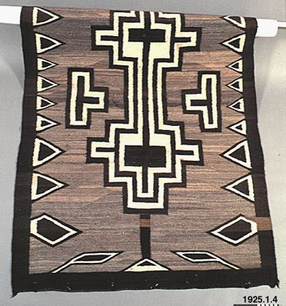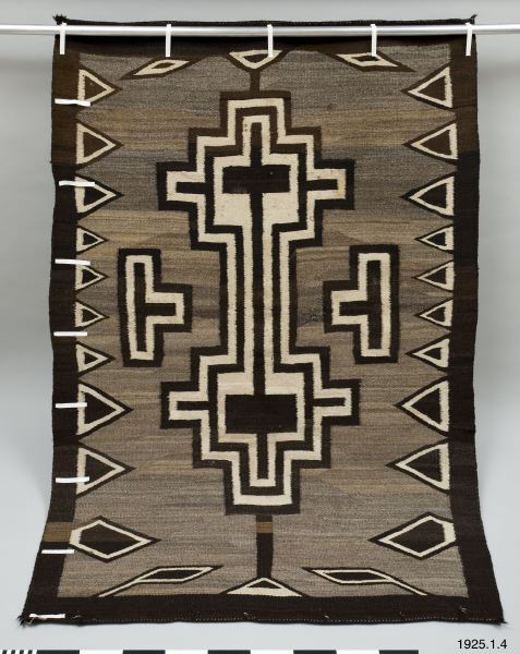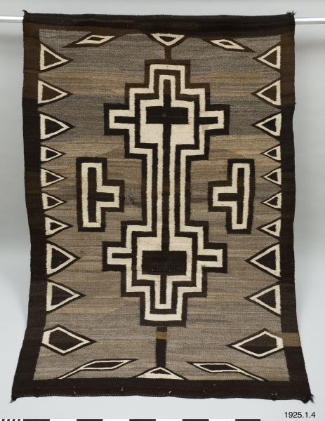 Naturliga ullfärger i grått, vitt, mörkbrunt och svart. Mittfältet korsmotiv i svart och vitt. Tvenne T-formiga figurer på ömse sidor. Innanför den brunsvarta bården spetsvinkliga figurer på långsidorna och på kortsidorna tvenne skaftade, rutformiga figurer på ömse sidor om en trubbvinklig. På ett ställe ett hål, där en söndrig stoppning sitter. (generalkatalogen)