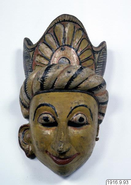 The turban is in folds, carved and painted in pale yellow and with black and pink lines. On top of it is a small, porch-like diadem, painted with petal and geometric designs. The face, with its straight nose, is painted in greenish yellow. There are fairly deep slots under the eyes. The mouth is closed and the lips painted in pink. There is one ear with an earring. The left ear is missing.