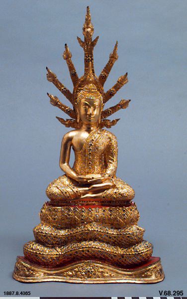 Buddha under ormkungens huva. Under fregatten Vanadis uppehåll i Bangkok köpte Hjalmar Stolpe en liten samling buddhastatyetter. Dessa är alla rikt dekorerade och förgyllda i den stil som var förhärskande i Bangkok under 1800-talets senare del. Denna buddhastatyett föreställer ¿Buddha under naga(orm)-konungen Mukalindas huva¿. Detta är en scen ur den historiska Buddhas liv. Enligt traditionen ...