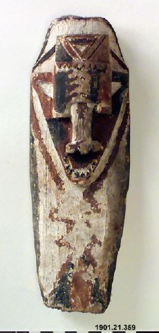 Mask, eller maskliknande skulptur av skuret och bemålat trä. Masken är flat med ansikte, näsa, ögonbryn och huvudbonad i relief. Den är målad vit med bruna och svarta detaljer. Baksidan är slät och målad vit. Se Bodrogi, 1961: 28-29. (NS)