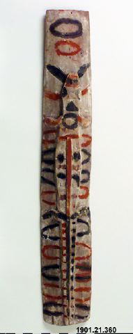 • Skulptur av skuret och bemålat trä. Skulpturen är rektangulär med en ödla utskuren i relief. Baksidan är slät och obemålad. Den är målad vit med detaljer i rött och svart.