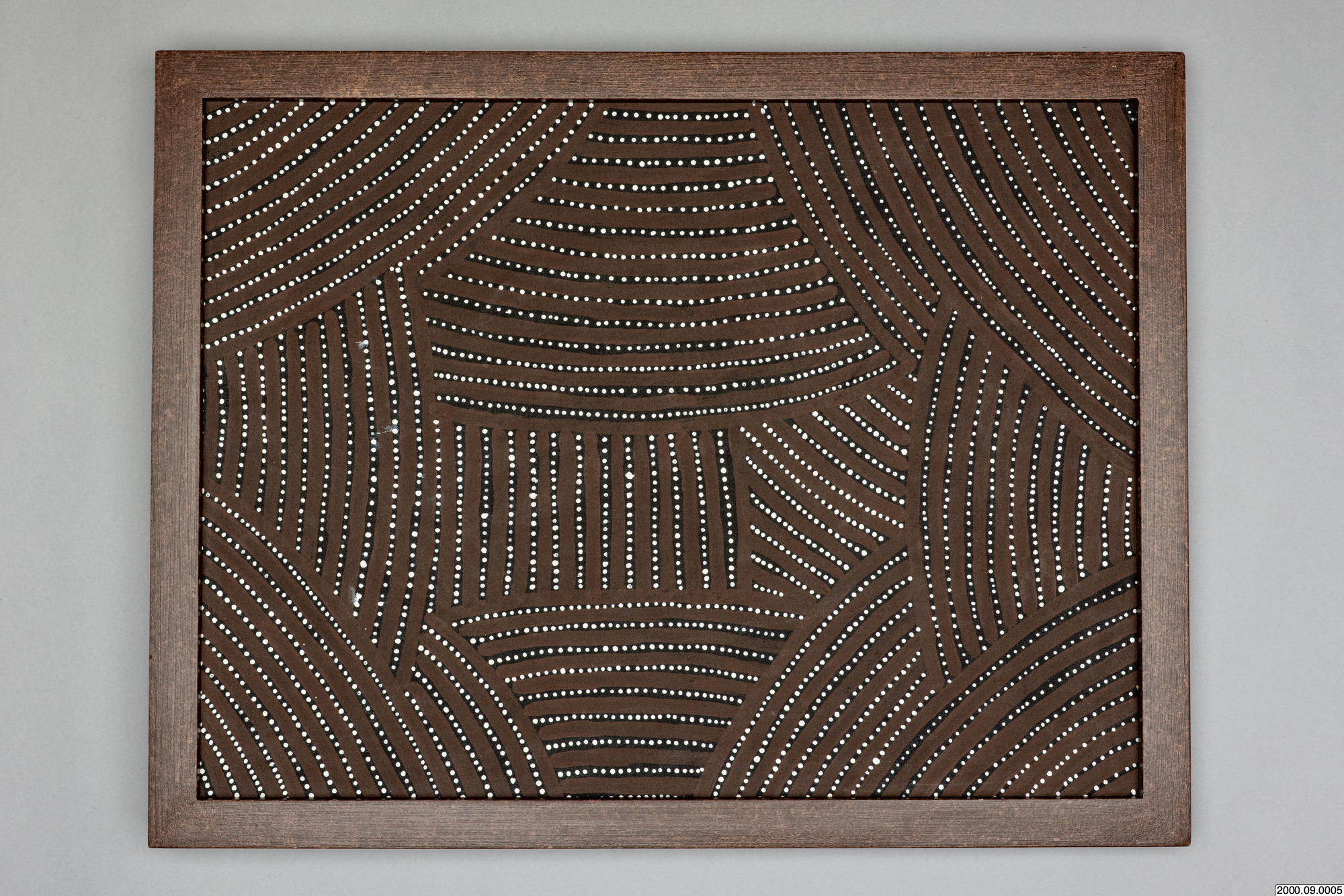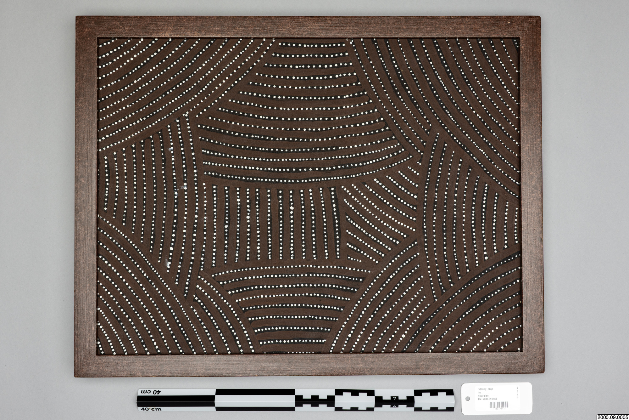 Utställd 2000-05-17 - 2000-10-01 i Etnografiska museet, Stockholm av Tre Världsbilder, Samtida konst från tre kontinenter., Vandra varsamt - Aboriginsk konst.