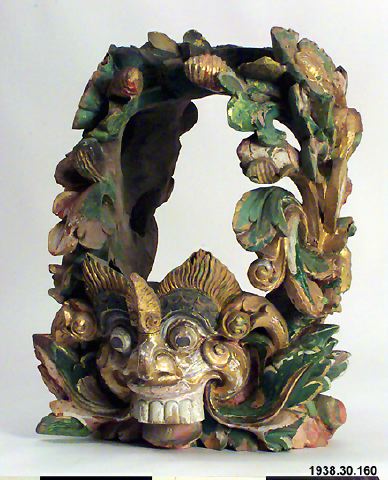 Arkitektoniskt ornament för hem eller tempelbyggnad. Skulpturen föreställer ett demonansikte omgivet av bladrankor och blommor i ett genombrutet arbete. Skulpturen är ihålig och har en stor öppning på fram- och baksida. Den är målad i grönt, rött,svart, vitt och guld.