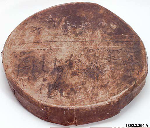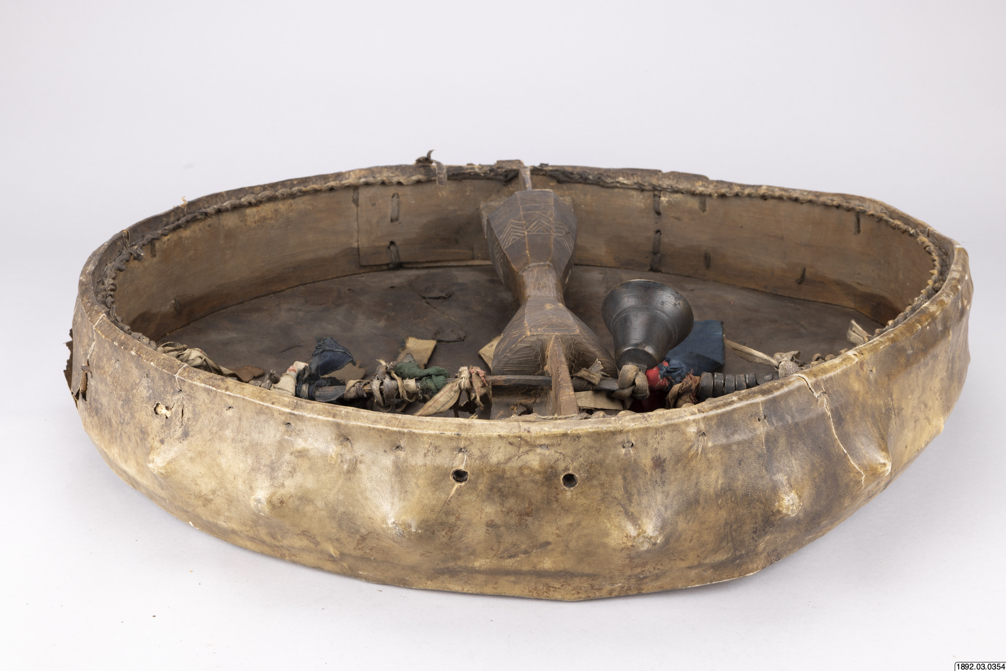 Function: Used in shamanic rituals/séances among the Chakass of the Minushinsk area, upper Jennisey basin, Southern Siberia. A short, and far from complete description of the drum could read like this: The front side of the drum, the skin (čagyčych) is painted with a cosmological representation of the upper world of the high God (Kubaj Khan) also containing a stylized Milky Way (tiger-kurum), being separated from the underworld, whose greedy ruler is Ärlik Khan, by three lines representing “the three layers of our earth”, in red, black and white). In the under-world human beings and animals can be seen, and spirits who assist the shaman. Two birch trees can be seen as well, associated with the realm of death. The back side is no less symbolic in its construction, with a horizontal and a vertical bar, with the intricately shaped and ornamented handle of the drum, bells made of brass as well as iron, small sickle-formed pendants and strips of cloth. All have their expressed meanings and functions, the last ones (čalaba) being associated with the power that the shaman wields. The drum is beaten with a stick made of a bone. The drum and the stick are metaphorically spoken of as the shaman’s “horse and whip”, his “bow and arrow”, his “boat and rudder”. Acquisition Acquired by the Swedish Orientalist Fredrik Robert Martin (1868-1933) during his travels in the Ob and Yenisey areas in 1891, a journey mainly for acquiring ethnographic and archaeological collections. From his report one can learn about the exact circumstances of the acquisition: “ By chance I was informed that an old shaman drum could be found on board a lodkorna (local boat). After many difficulties the owner brought it out, which resulted in protracted haggling. I was absolutely determined to acquire the drum, but its owner was equally determined not to sell it. At the end, somewhat annoyed, he said `I am not selling it for less than 6 rubels, calculating that at such a price nobody would be willing to pay. I immediately handed over what he had just demanded, which made him rather concerned. Some other old men expressed their anger over the fact that he had parted with such a rare object. I had to increase the sum to calm them down-- a bottle of vodka surely contributed to this.” Why this is a masterpiece Shaman drums are much sought after by Ethnographic museums since they provide a rare entry into and an explicit form against which one can talk about the complex cosmological world contained in shamanic religion and shamanic praxis. They are also often aesthetically beautiful pieces to behold and contemplate over. Among the shaman drums owned by the Ethnographic museum this is surely the best preserved one, and furthermore the one that most clearly conveys a number of basic principles in shamanic cosmology. History of the Object In 1892 F.R. Martin sold this object to the Museum of Ethnography as part of a big collection brought together in Siberia. Before that the object had evidently belonged to a shaman from the chakass people (who speak a northern Turkic language). Martin called these people “Abakantartars”. It is uncertain whether the man who sold the drum to Martin was the shaman who had once used it. (Virtual Collection of Masterpieces, http://masterpieces.asemus.museum/Default.aspx)