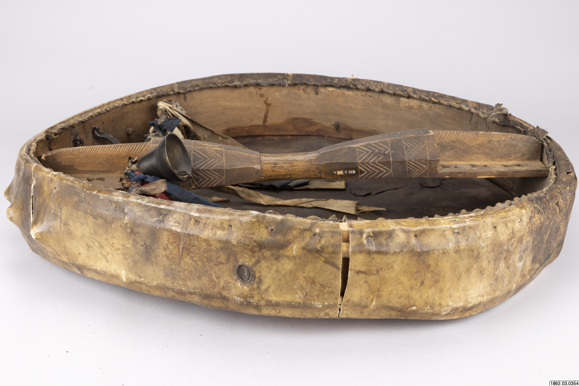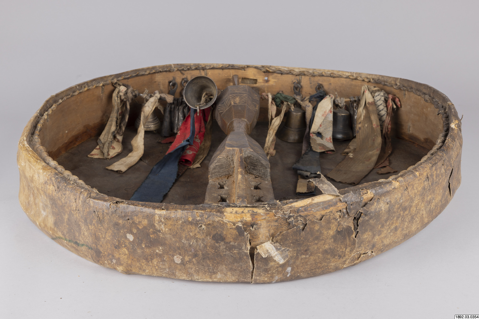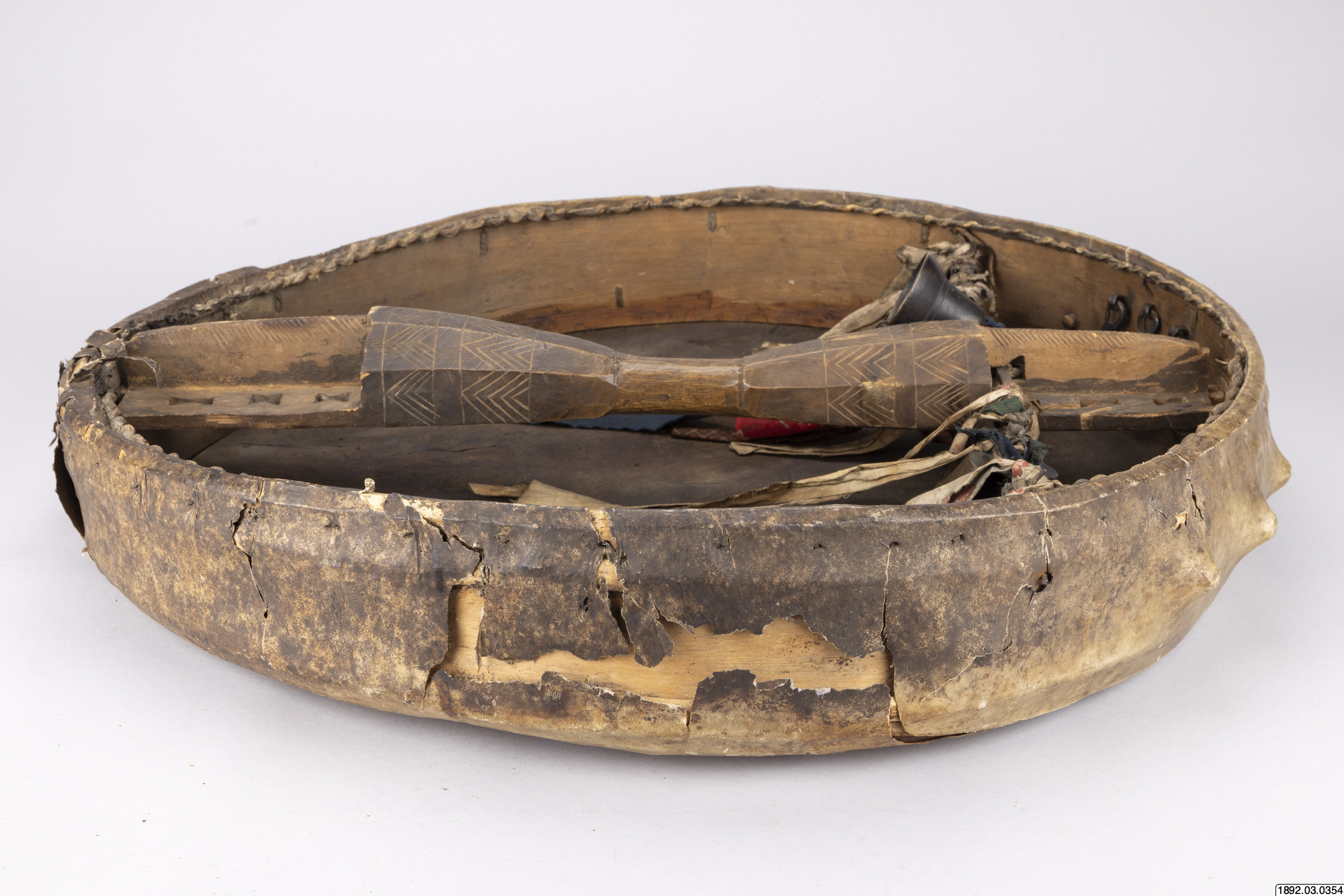 Trumma med trumpinne. Trumman är av trä, klädd med skinn. Snidat trähandtag och en tvärribba där olika tygbitar och metallklocker hänger ner. En spadformad trumpinne av ben eller horn. I änden av handtaget är en läderrem fästad, vari det sitter en metallring med olikfärgade tygband (röda, bruna, svarta).