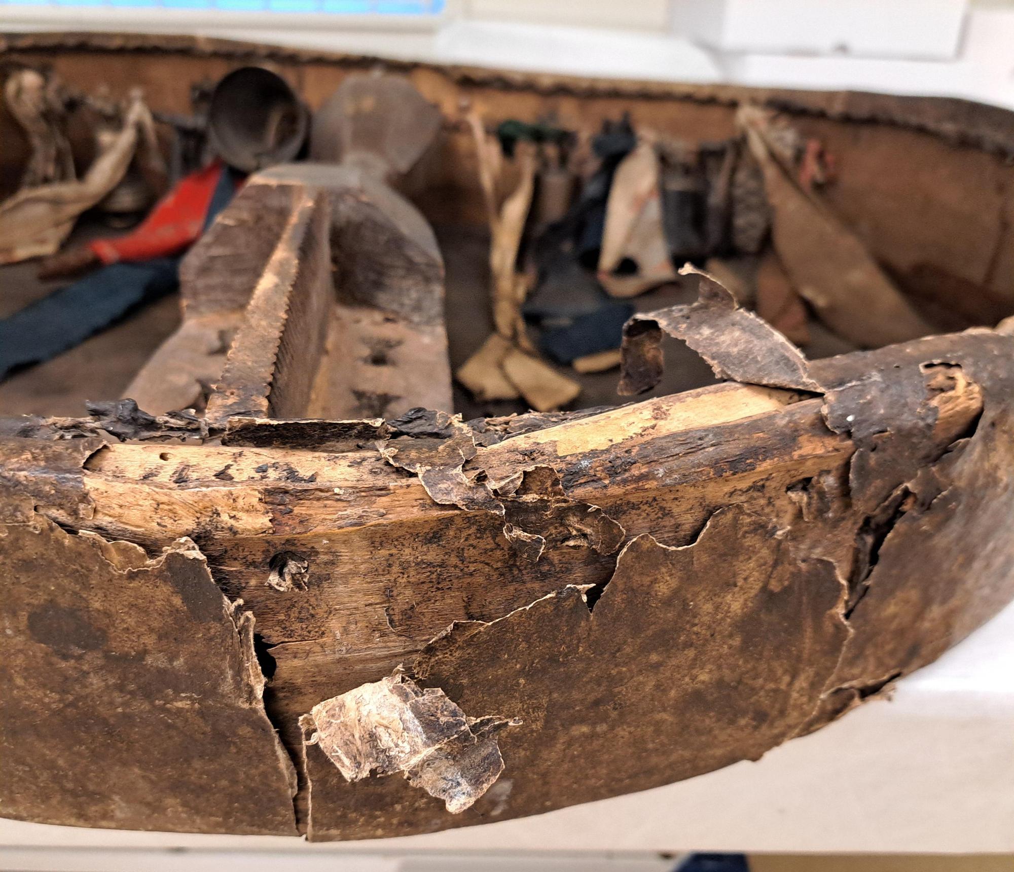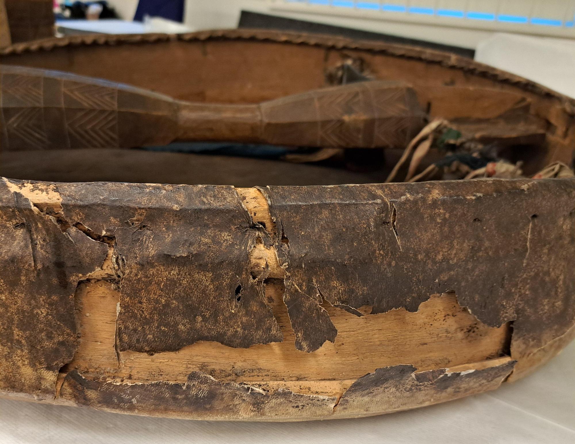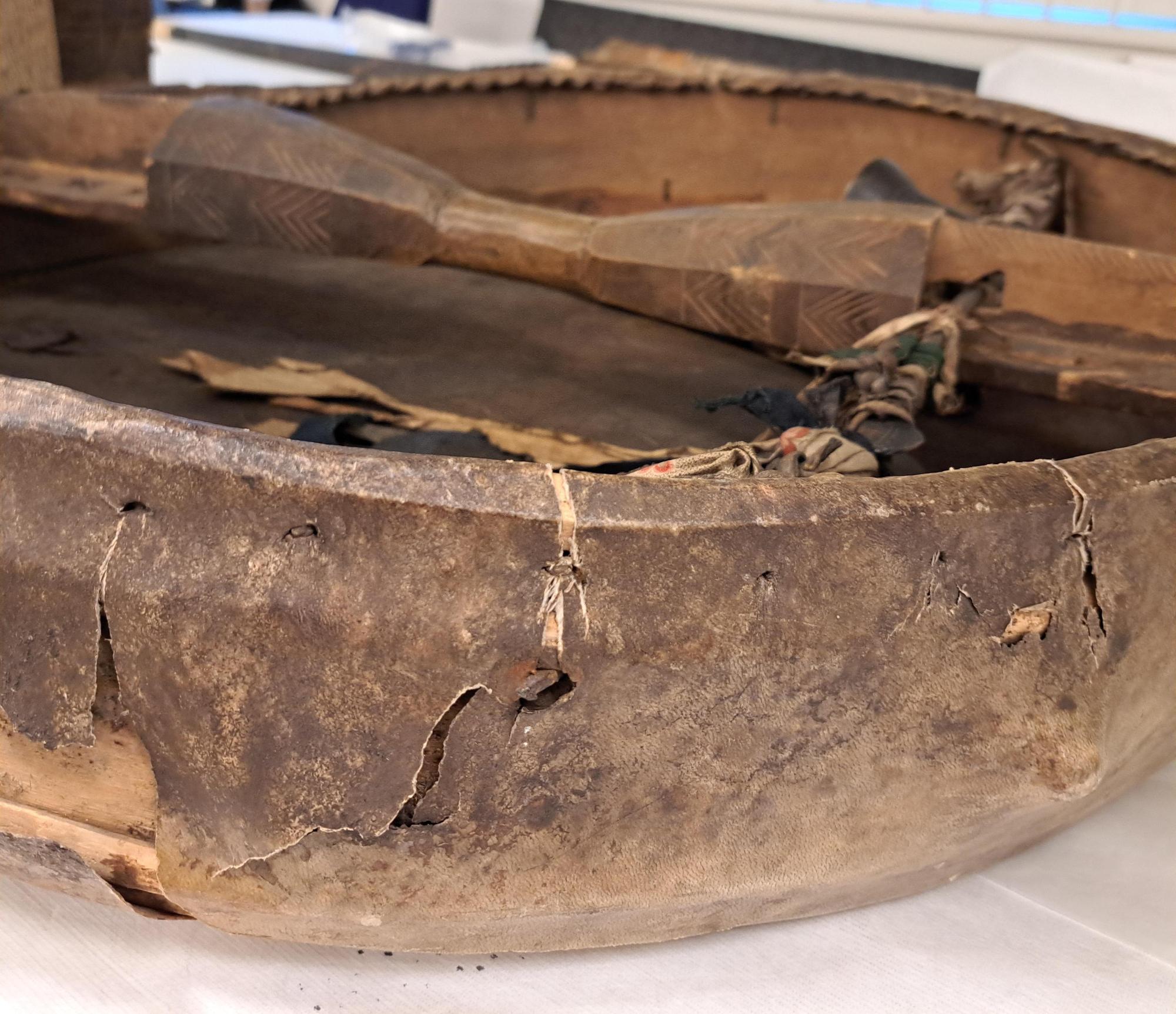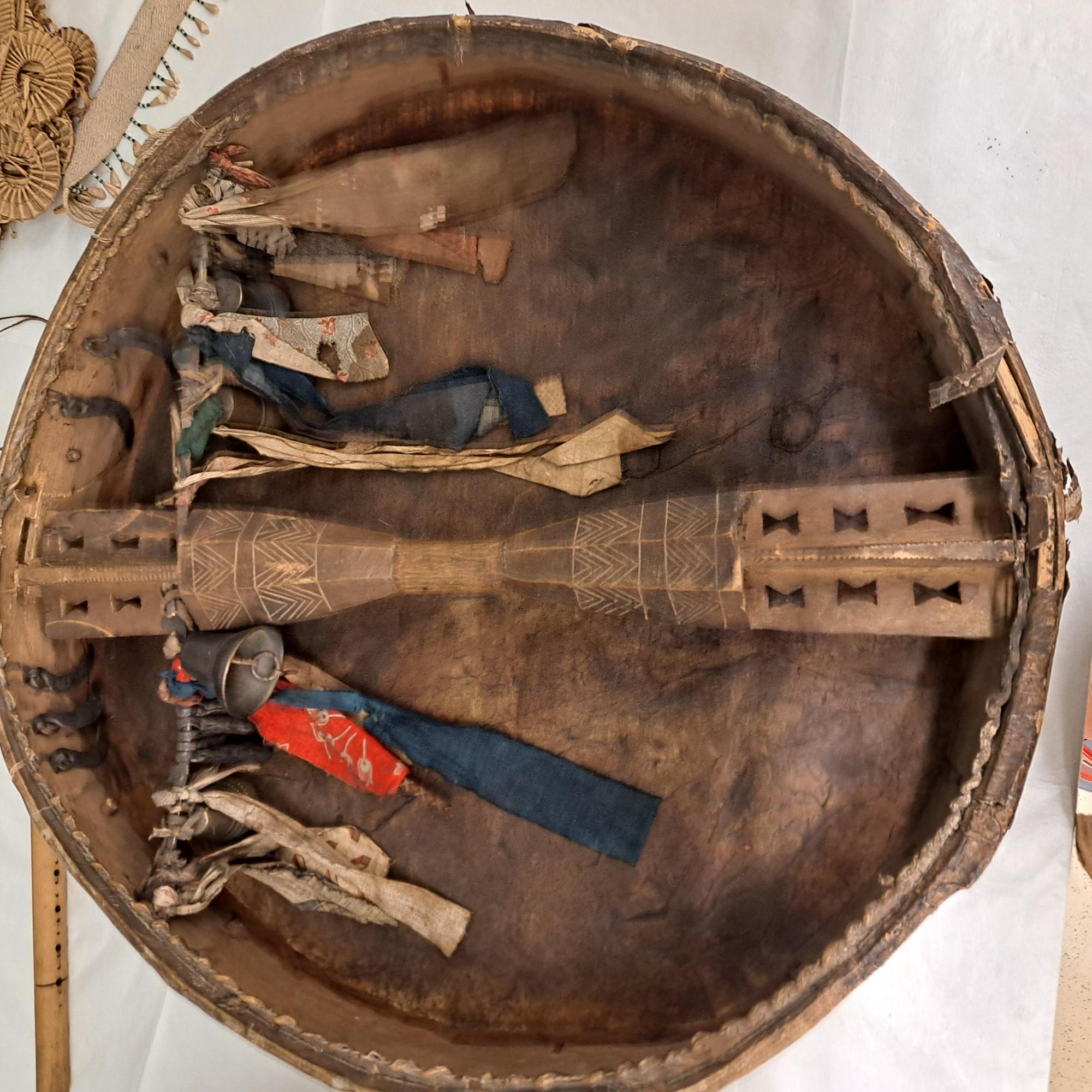 Trumma med trumpinne. Trumman är av trä, klädd med skinn. Snidat trähandtag och en tvärribba där olika tygbitar och metallklocker hänger ner. En spadformad trumpinne av ben eller horn. I änden av handtaget är en läderrem fästad, vari det sitter en metallring med olikfärgade tygband (röda, bruna, svarta).