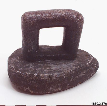 • Strykjärn av täljsten. Urholkningen på sidan är gjord för tummen. Strykjärn har blivit nödvändiga för grönländskorna sedan de fått europeiska tyger.