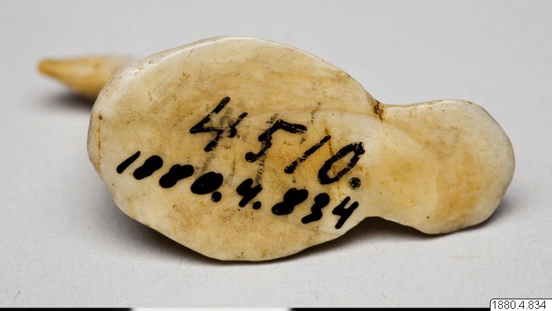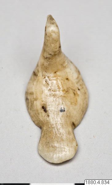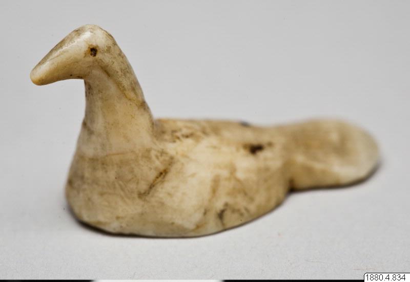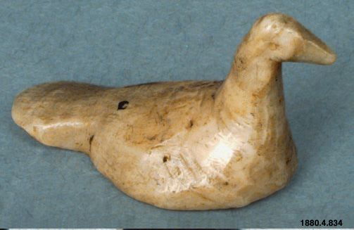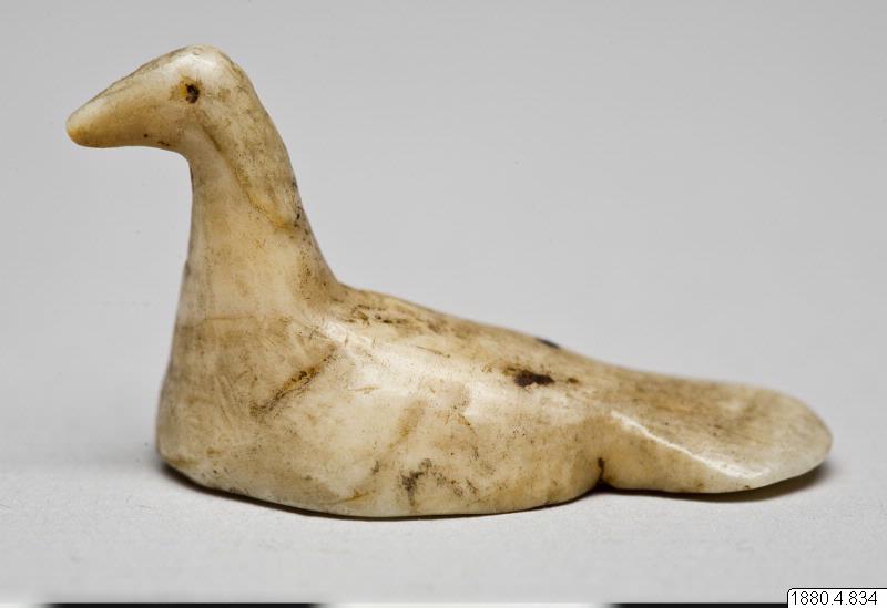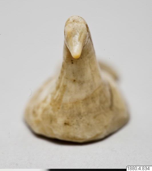 • Skulptur föreställande en fågel. Kroppen låg, stjärten stor och platt. Halsen rak, tjock, huvudet från sidorna tillplattat. Inskärningar för ögonen. (generalkatalogen)