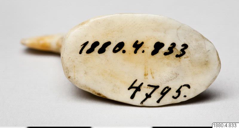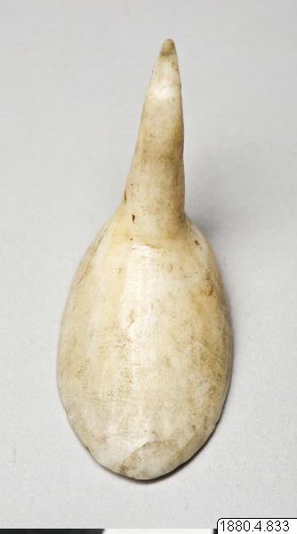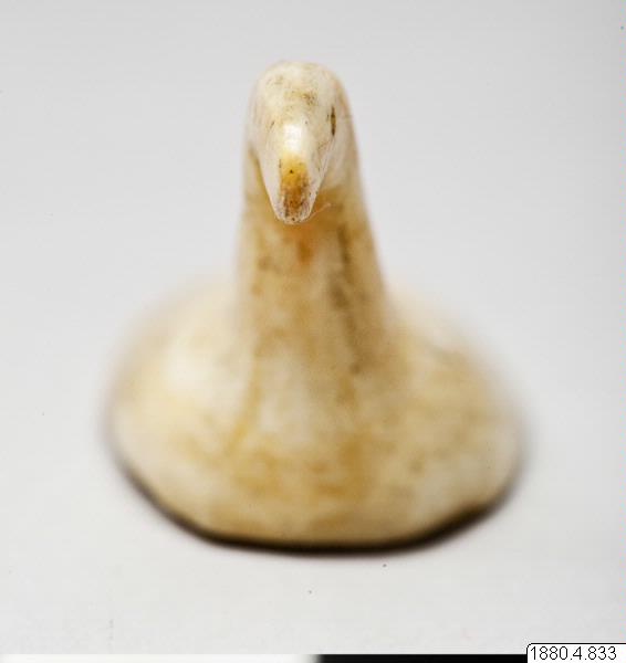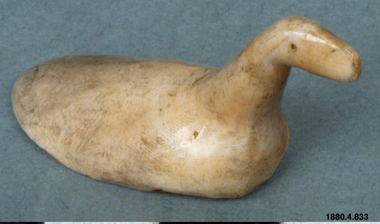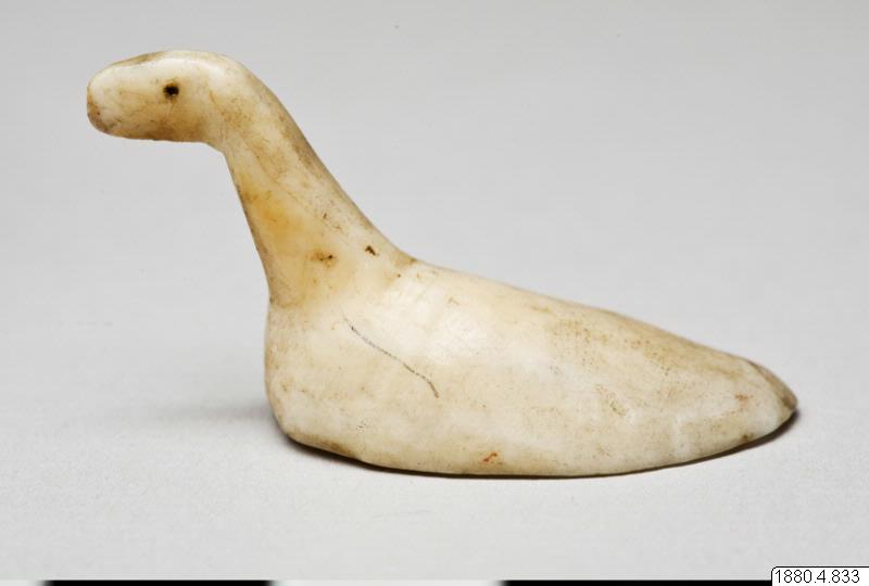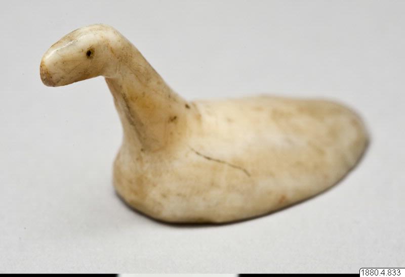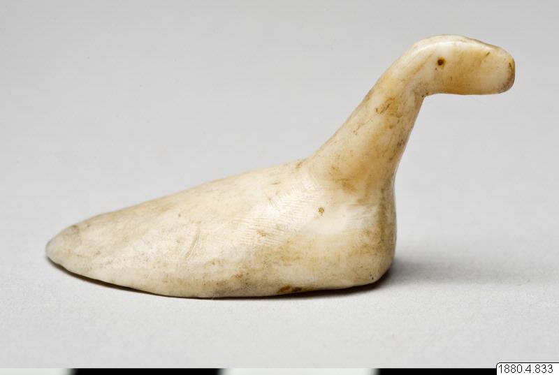 Skulptur föreställande en fågel. Kroppen bred och bakåtlutande. Halsen framsträckt. Huvudet platt med trubbig näbb och prickskärningar för ögonen. Generalkatalogen.