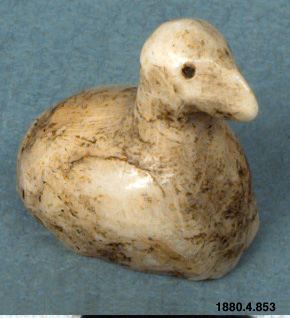 • Amulett/skulptur föreställande en fågel. Kroppen liten och tjock. Huvudet runt, avsmalnande mot näbben. Inskärningar för ögonen.