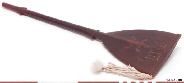 • Stridsklubba (Taike), av "Pui"-trä. Trint skaft med skivformigt huvud med figurer ifrån det mörka träet skiljaktig färg samt inristade ornament.