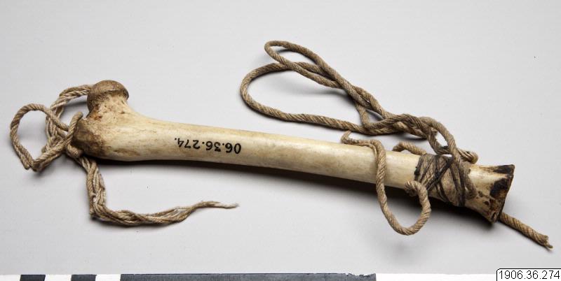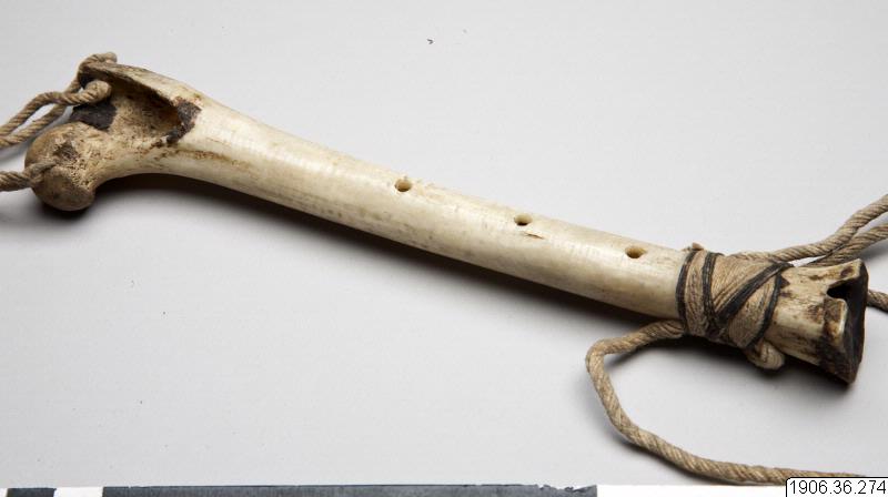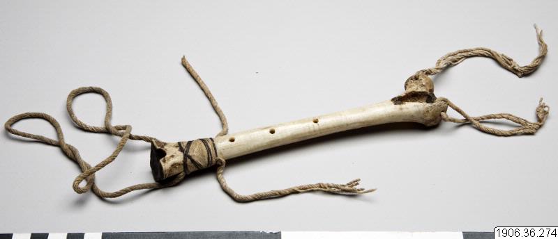 Flöjt av ben. (generalkatalogen) Flöjt av ben med tvinnade trådar i ena ändan och ett bärband i den andra ändan.