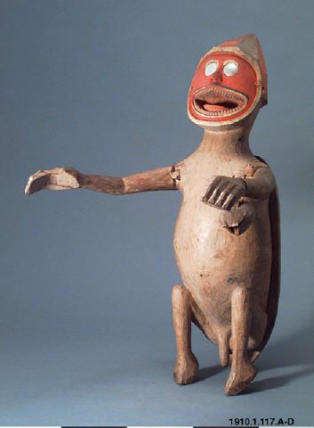 Gudabild av trä. Ögonen äro av Nautilus- skal, ansiktet är målat rött och gult. I den öppnade munnen ser man ett stort antal tänder. Armarna äro framåt- sträckta och prydda vid handleden med en liten cocosnöt. Figuren är ihålig. Ryggdelen låter sig avtagas. Popanz. Nikobarerna Indien. (generalkatalogen)
