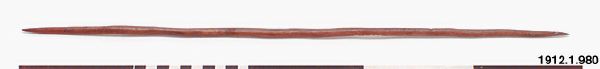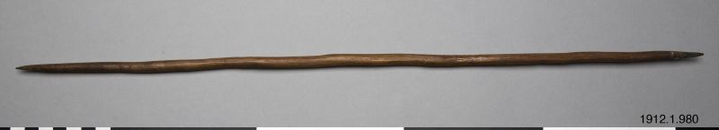 Smal, spetsig trästicka med två genomborrade hål i. Användningsområde okänt, men Kim Akerman föreslår att stickan använts i offentliga begravningsceremonier och inte klassas som ett hemligt-heligt för...